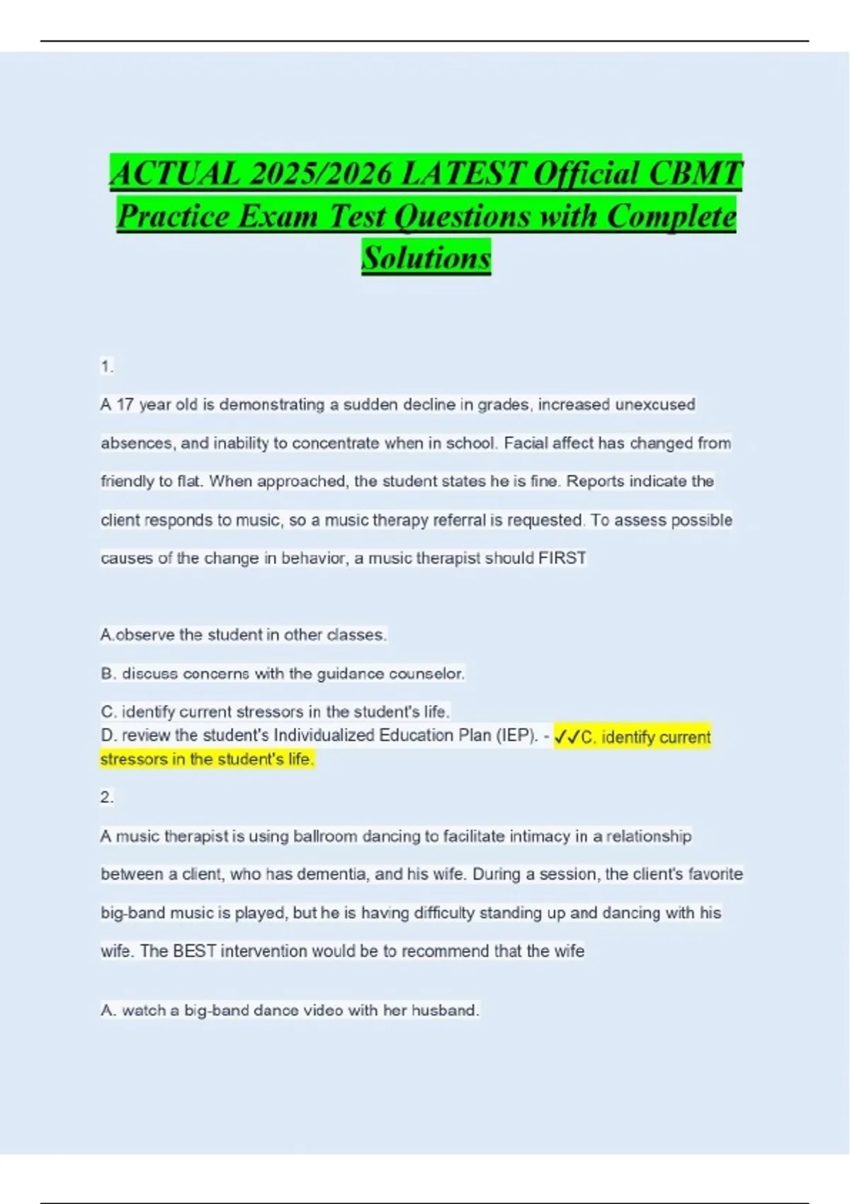 ACTUAL 2025/2026 LATEST Official CBMT Practice Exam Test Questions with Complete Solutions 1. A 17 year old is demonstrating a sudden decline in grades, increased unexcused absences, and inability to concentrate when in school. Facial affect has changed from friendly to flat. When approached, the student states he is fine. Reports indicate the client responds to music, so a music therapy referral is requested. To assess possible causes of the change in behavior, a music therapist should FIRST A.observe the student in other classes. B. discuss concerns with the guidance counselor. C. identify current stressors in the student's life. D. review the student's Individualized Education Plan (IEP). - ️️C. identify current stressors in the student's life.