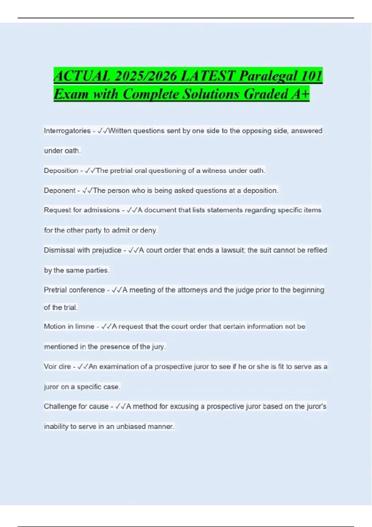 ACTUAL 2025/2026 LATEST Paralegal 101 Exam with Complete Solutions Graded A+ Interrogatories - Written questions sent by one side to the opposing side, answered under oath. Deposition - The pretrial oral questioning of a witness under oath. Deponent - The person who is being asked questions at a deposition. Request for admissions - A document that lists statements regarding specific items for the other party to admit or deny. Dismissal with prejudice - A court order that ends a lawsuit; the suit cannot be refiled by the same parties. Pretrial conference - A meeting of the attorneys and the judge prior to the beginning of the trial. Motion in limine - A request that the court order that certain information not be mentioned in the presence of the jury.