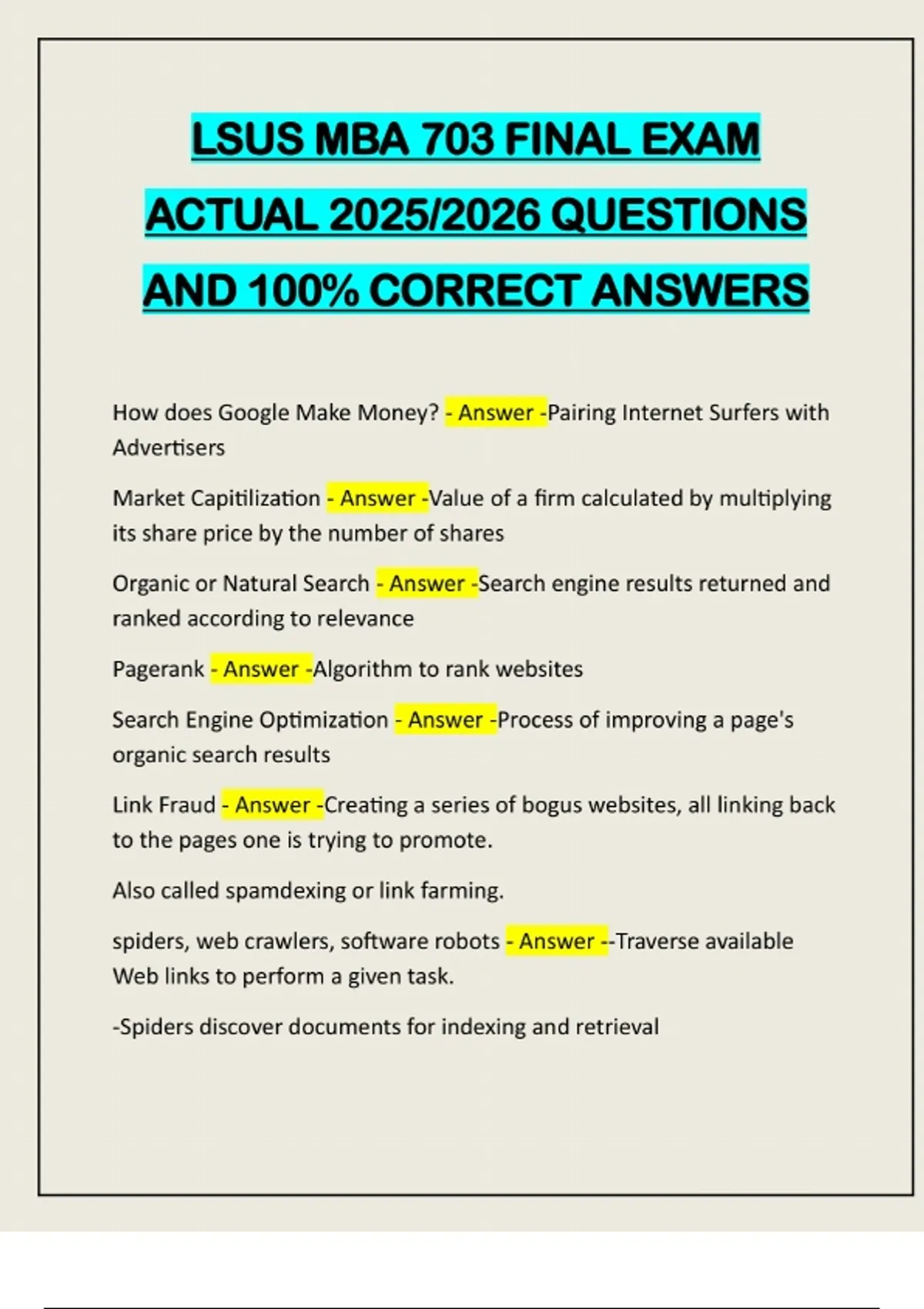 LSUS MBA 703 FINAL EXAM ACTUAL 2025/2026 QUESTIONS AND 100% CORRECT ANSWERS How does Google Make Money? - Answer -Pairing Internet Surfers with Advertisers Market Capitilization - Answer -Value of a firm calculated by multiplying its share price by the number of shares Organic or Natural Search - Answer -Search engine results returned and ranked according to relevance Pagerank - Answer -Algorithm to rank websites Search Engine Optimization - Answer -Process of improving a page's organic search results Link Fraud - Answer -Creating a series of bogus websites, all linking back to the pages one is trying to promote. Also called spamdexing or link farming. spiders, web crawlers, software robots - Answer --Traverse available Web links to perform a given task. -Spiders discover documents for indexing and retrievalCache - Answer -A temporary storage space used to speed computing tasks. Dark Web - Answer -Internet content that can't be indexed by Google and other search engines. Server Farm - Answer -Network of computer servers running software to coordinate their collective use Fault Tolerant - Answer -capable of continuing operation even if a component fails