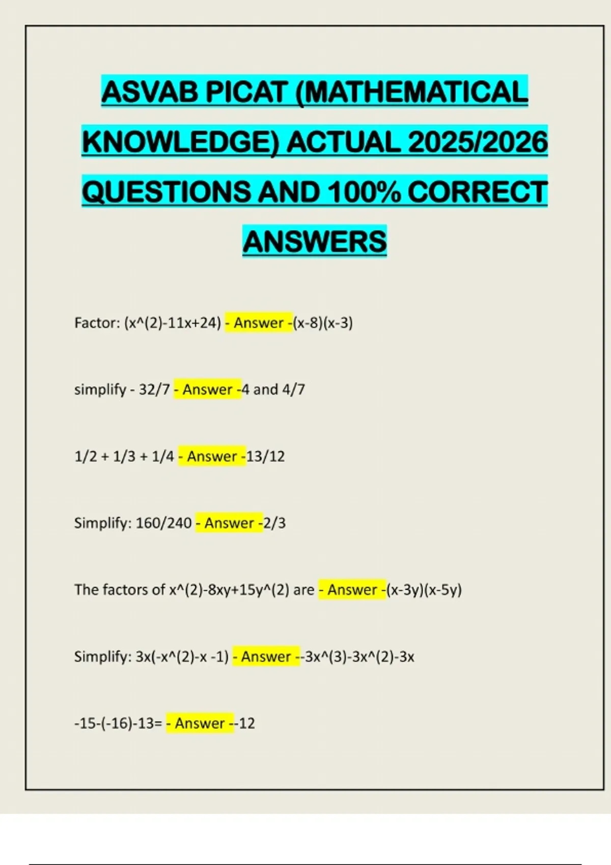 ASVAB PICAT (MATHEMATICAL KNOWLEDGE) ACTUAL 2025/2026 QUESTIONS AND 100% CORRECT ANSWERS Factor: (x^(2)-11x+24) - Answer -(x-8)(x-3) simplify - 32/7 - Answer -4 and 4/7 1/2 + 1/3 + 1/4 - Answer -13/12 Simplify: 160/240 - Answer -2/3 The factors of x^(2)-8xy+15y^(2) are - Answer -(x-3y)(x-5y) Simplify: 3x(-x^(2)-x -1) - Answer --3x^(3)-3