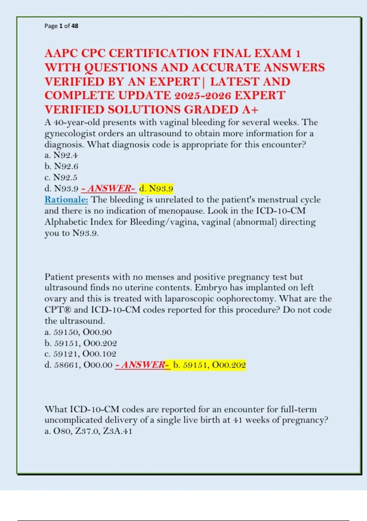 AAPC CPC CERTIFICATION FINAL EXAM 1 WITH QUESTIONS AND ACCURATE ANSWERS VERIFIED BY AN EXPERT| LATEST AND COMPLETE UPDATE EXPERT VERIFIED SOLUTIONS GRADED A+