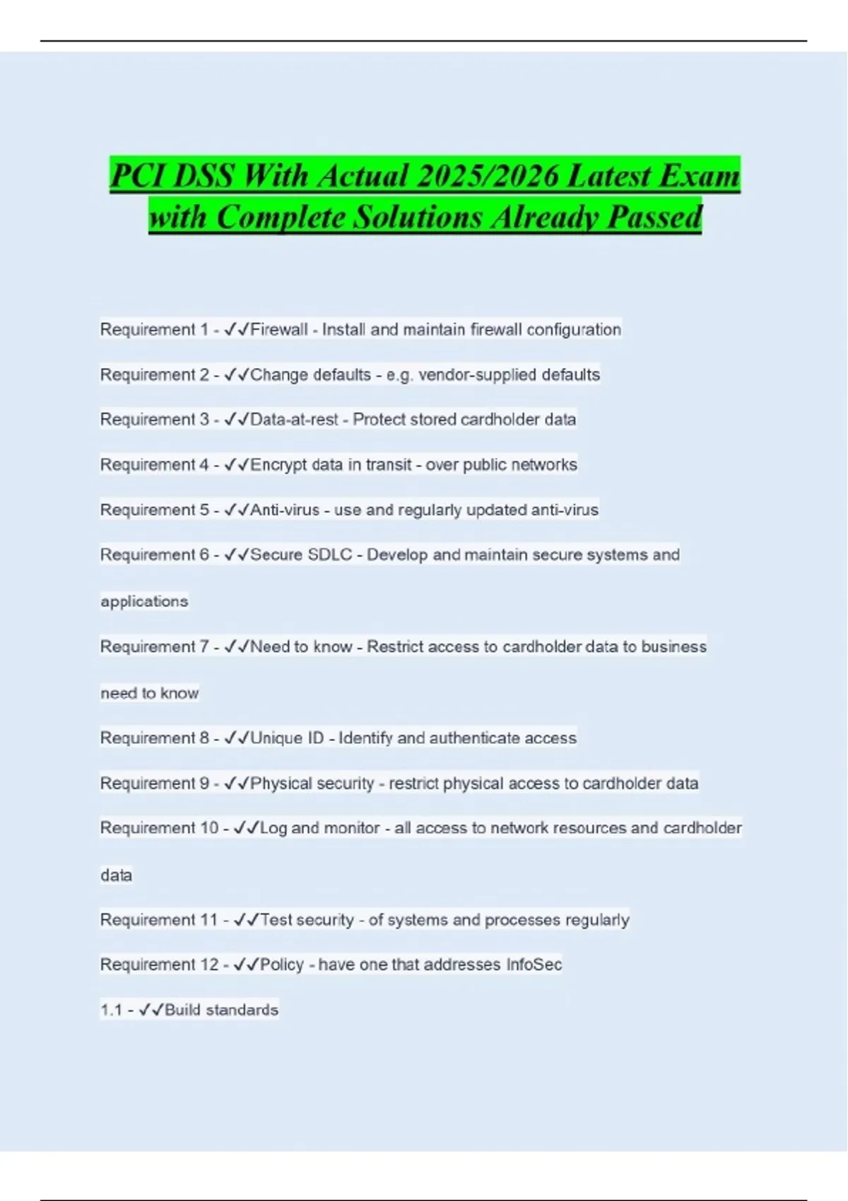 PCI DSS With Actual 2025/2026 Latest Exam with Complete Solutions Already Passed Requirement 1 - ️️Firewall - Install and maintain firewall configuration Requirement 2 - ️️Change defaults - e.g. vendor-supplied defaults Requirement 3 - ️️Data-at-rest - Protect stored cardholder data Requirement 4 - ️️Encrypt data in transit - over public networks Requirement 5 - ️️Anti-virus - use and regularly updated anti-virus Requirement 6 - ️️Secure SDLC - Develop and maintain secure systems and applications Requirement 7 - ️️Need to know - Restrict access to cardholder data to business need to know Requirement 8 - ️️Unique ID - Identify and authenticate access Requirement 9 - ️️Physical security - restrict physical access to cardholder data Requirement 10 - ️️Log and monitor - all access to network resources and cardholder data Requirement 11 - ️️Test security - of systems and processes regularly Requirement 12 - ️️Policy - have one that addresses InfoSec 1.1 - ️️Build standards