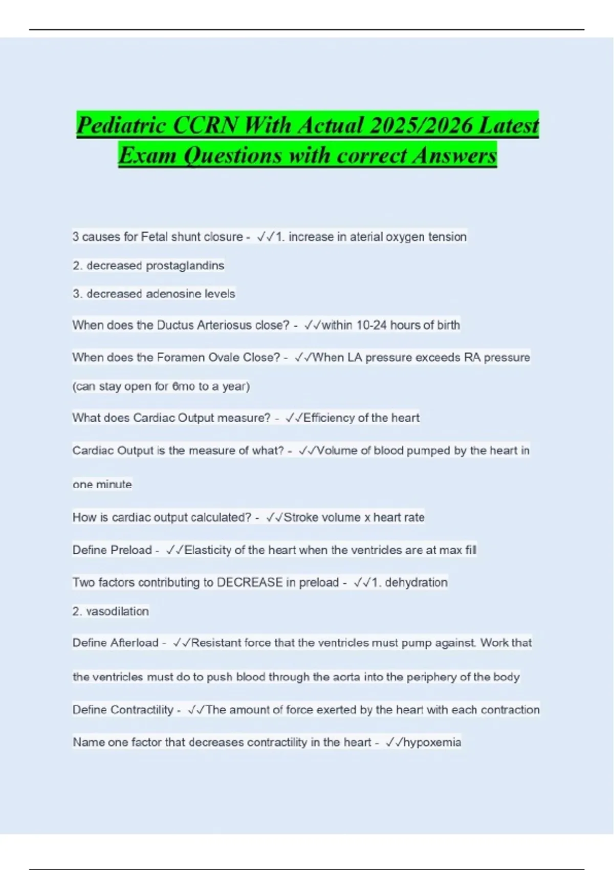 Pediatric CCRN With Actual 2025/2026 Latest Exam Questions with correct Answers 3 causes for Fetal shunt closure - 1. increase in aterial oxygen tension 2. decreased prostaglandins 3. decreased adenosine levels When does the Ductus Arteriosus close? - within 10-24 hours of birth When does the Foramen Ovale Close? - When LA pressure exceeds RA pressure (can stay open for 6mo to a year) What does Cardiac Output measure? - Efficiency of the heart Cardiac Output is the measure of what? - Volume of blood pumped by the heart in one minute How is cardiac output calculated? - Stroke volume x heart rate Define Preload - Elasticity of the heart when the ventricles are at max fill Two factors contributing to DECREASE in preload - 1. dehydration 2. vasodilation Define Afterload - Resistant force that the ventricles must pump against. Work that the ventricles must do to push blood through the aorta into the periphery of the body Define Contractility - The amount of force exerted by the heart with each contraction Name one factor that decreases contractility in the heart - hypoxemia