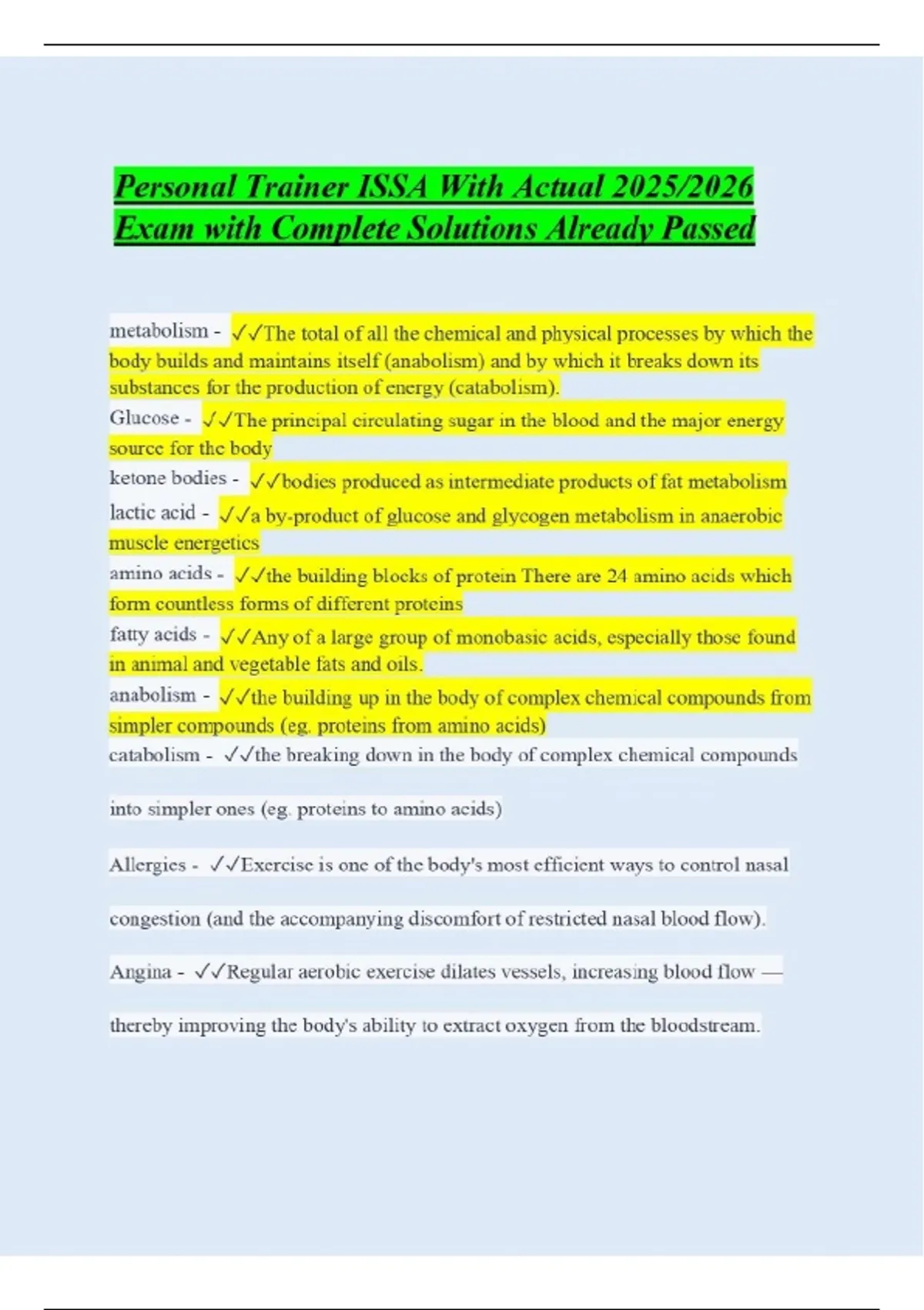 Personal Trainer ISSA With Actual 2025/2026 Exam with Complete Solutions Already Passed metabolism - The total of all the chemical and physical processes by which the body builds and maintains itself (anabolism) and by which it breaks down its substances for the production of energy (catabolism). Glucose - The principal circulating sugar in the blood and the major energy source for the body ketone bodies - bodies produced as intermediate products of fat metabolism lactic acid - a by-product of glucose and glycogen metabolism in anaerobic muscle energetics