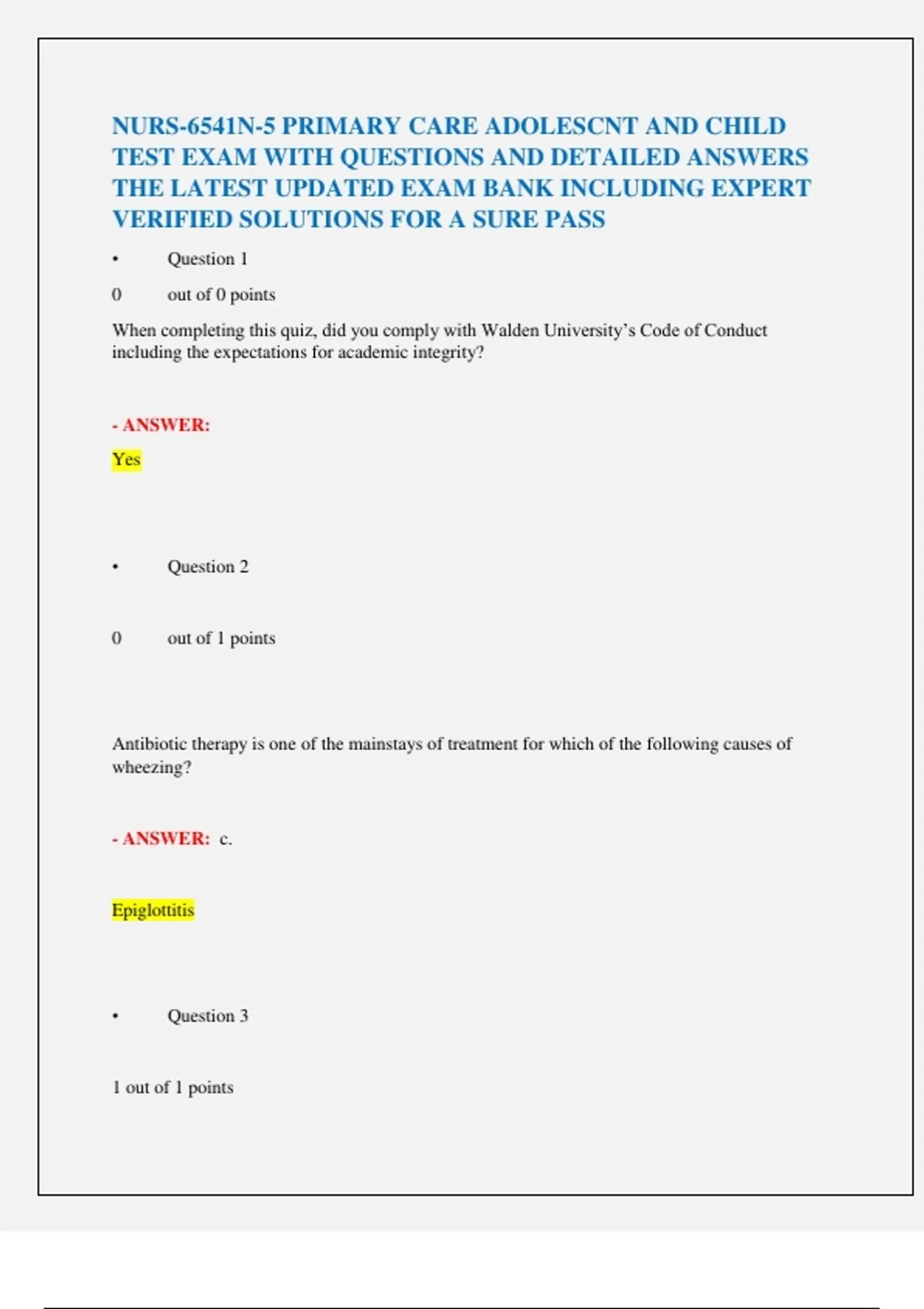 Download the NURS 6541N Primary Care of the Adolescent and Child Exam 2025–2026. Includes verified nursing questions and answers for advanced practice review.