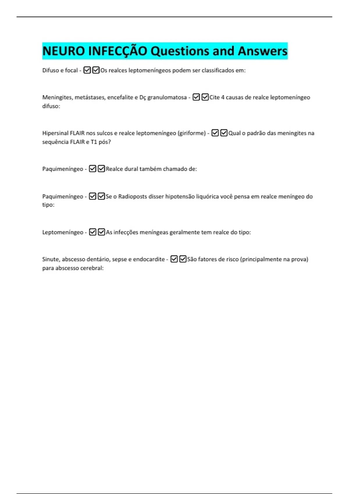 NEURO INFECÇÃO Questions and Answers Difuso e focal - Os realces leptomeníngeos podem ser classificados em: Meningites, metástases, encefalite e Dç granulomatosa - Cite 4 causas de realce leptomeníngeo difuso: Hipersinal FLAIR nos sulcos e realce leptomeníngeo (giriforme) - Qual o padrão das meningites na sequência FLAIR e T1 pós? Paquimeníngeo - Realce dural também chamado de: