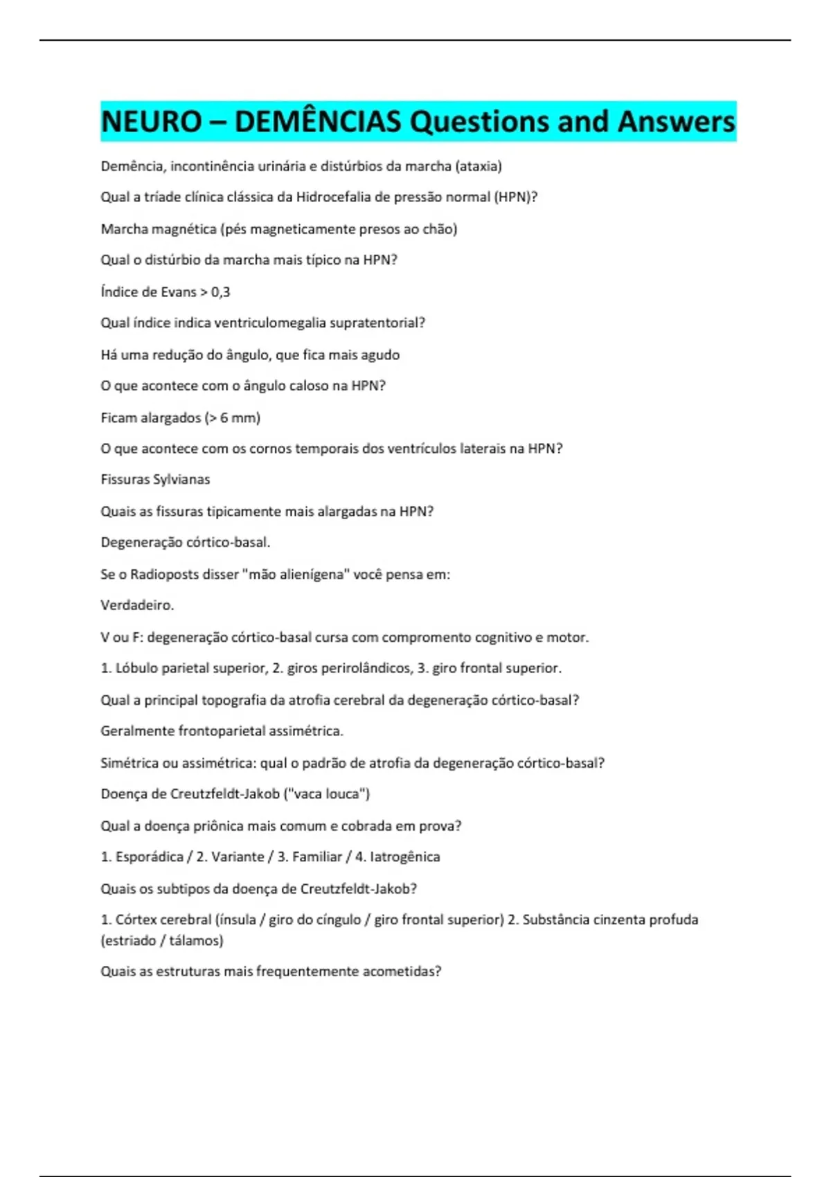 NEURO – DEMÊNCIAS Questions and Answers