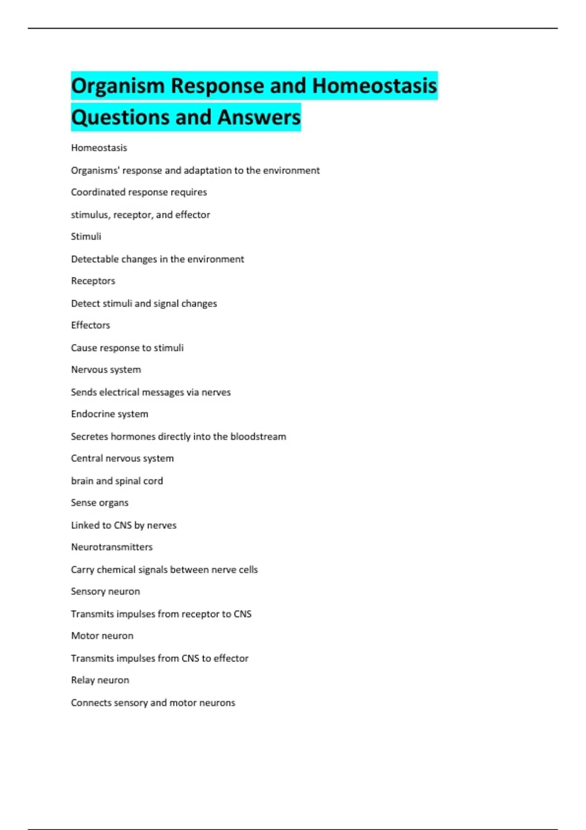 Organism Response and Homeostasis Questions and Answers Homeostasis Organisms' response and adaptation to the environment Coordinated response requires stimulus, receptor, and effector Stimuli Detectable changes in the environment Receptors Detect stimuli and signal changes