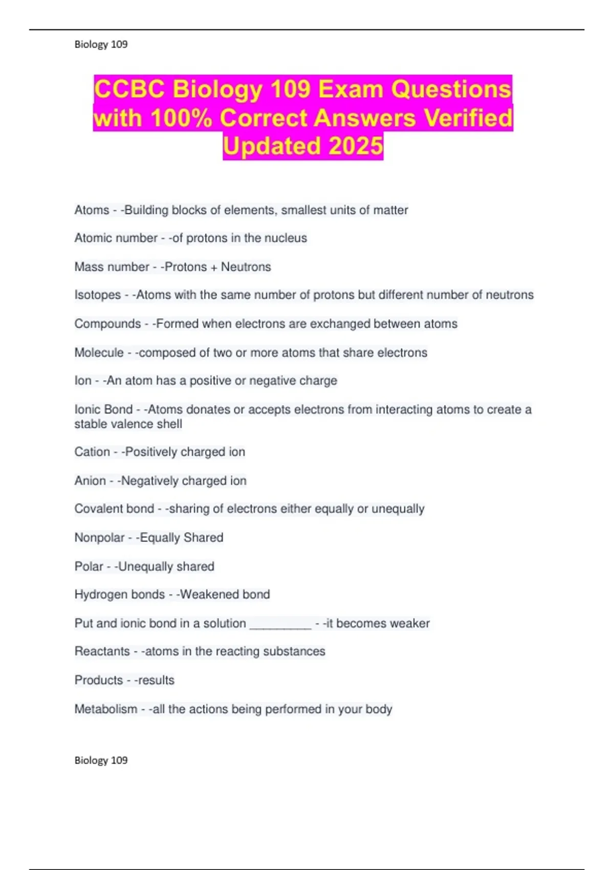 CCBC Biology 109 Exam Questions with 100% Correct Answers Verified Updated 2025 Atoms - -Building blocks of elements, smallest units of matter Atomic number - -of protons in the nucleus Mass number - -Protons + Neutrons Isotopes - -Atoms with the same number of protons but different number of neutrons Compounds - -Formed when electrons are exchanged between atoms Molecule - -composed of two or more atoms that share electrons Ion - -An atom has a positive or negative charge Ionic Bond - -Atoms donates or accepts electrons from interacting atoms to create a stable valence shell Cation - -Positively charged ion Anion - -Negatively charged ion Covalent bond - -sharing of electrons either equally or unequally Nonpolar - -Equally Shared Polar - -Unequally shared Hydrogen bonds - -Weakened bond Put and ionic bond in a solution _________ - -it becomes weaker Reactants - -atoms in the reacting substances Products - -results Metabolism - -all the actions being performed in your body Biology 109 Biology 109 Biology 109 Work - -Movement of an object or change in physical structure Energy - -capacity to perform work Kinetic - -Energy of motion Potential energy - -stored energy Cellular work includes - --producing complex molecules -Moving material into in out of a cell Transfer of energy is - -not 100% efficient Skeletal muscle cells are an example of what type of energy? - -Potential energy Contraction - -turns potential to kinetic Byproduct of Contraction - -Heat Metabolic Pathway - -Series of complex reactions where the product is the reactant for another reaction Decomposition - -Reaction that breaks a molecule into smaller fragments Hydrolysis- - -Take a compound, combined with water, and it splits a large compound. Catabolism - -Taking big and complex components and breaking them down into their smaller components Synthesis - -Take two individual pieces and throughout the process to form a compound Dehydration synthesis - -Formation of a complex molecule by removing a water molecule Anabolism - -Taking smaller components and combining them to make them bigger and more complex Chemical reactions are _______ - -reversible, can operate in either direction Exchange reaction - -when you take a piece of a particular compound and exchange it Buffers - -pH in the body between 7.35-7.45, Chemical compounds that quickly bind or release hydrogen ions, Maintain pH of body when strong acids or bases are taken into the body or formed from chemical reactions within the body Biology 109 Carbohydrates - -Organic compounds (contains carbon) Carbon: Hydrogen: Oxygen - -1:2:1 Examples of Carbohydrates - -Sugars, Starches, Cellulose Most Important Function (Carbohydrates) - -Energy Source Monosaccharides - -Building blocks of carbohydrates (or monomers) Disaccharides - -double sugars Polysaccharides - -large complex carbohydrates Lipids - -Made of carbon, hydrogen, and very little oxygen Examples of Lipids - -Triglycerides, Steroids Triglycerides - -Made of a glycerol molecule and three fatty acid molecules Formed by 3 dehydration reactions Structural Lipids - -Cholesterol Phospholipids Glycolipids Steroids - -Large Lipid molecules, share distinctive carbon-ring framework, differ in functional groups attached to the ring Phospholipids and Glycolipids - -Both are synthesized by our cells Both are diglycerides Phospholipids - -Phosphate group links diglyceride to nonlipid group Micelles - -Hydrophobic tails go away from water, heads go towards areas of water Proteins - -large biomolecules, or macromolecules, consisting of one or more long chains of amino acid residues. Amino Acids - -Building blocks of peptides that in turn combine to form proteins Enzymes - -Catalysts in reactions Specificity - -lock and key Efficiency - -lowers activation energy for reaction