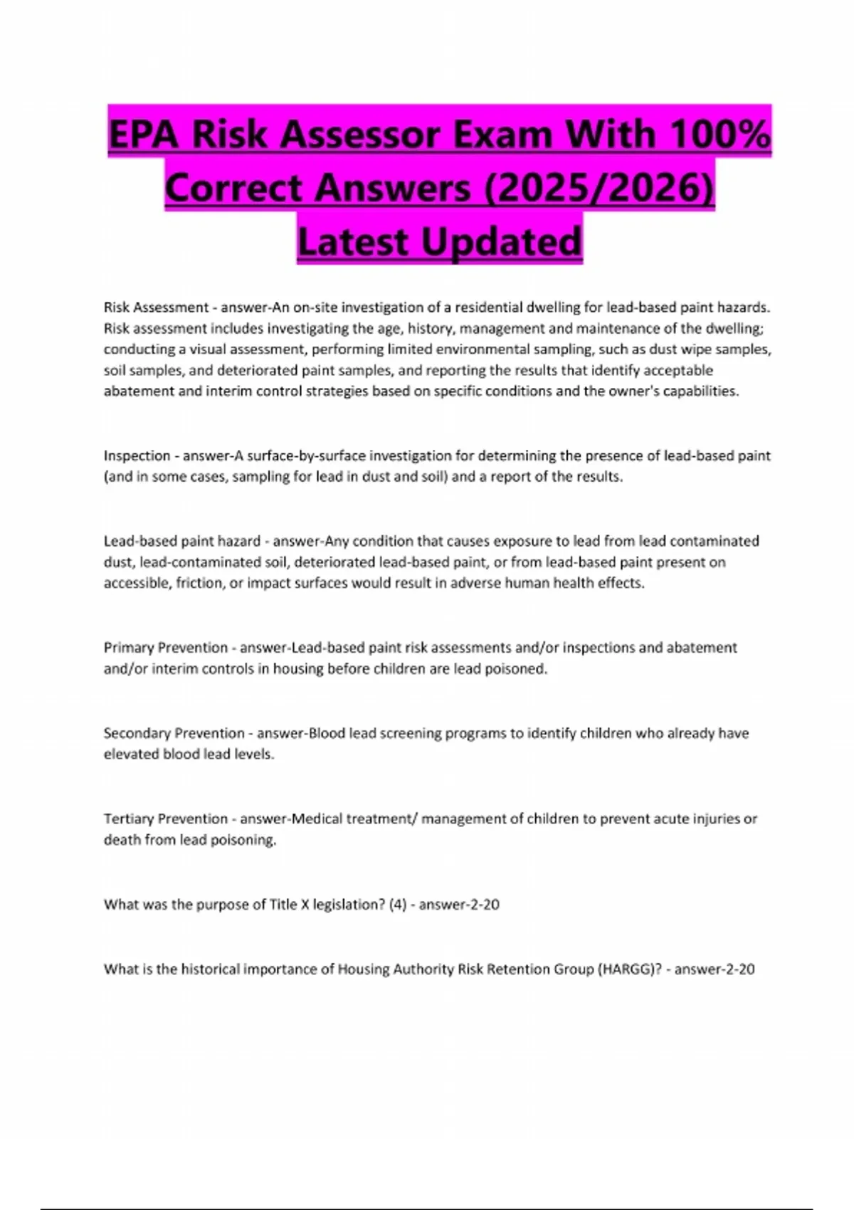 EPA Risk Assessor Exam With 100% Correct Answers (2025/2026) Latest Updated Risk Assessment - answer-An on-site investigation of a residential dwelling for lead-based paint hazards. Risk assessment includes investigating the age, history, management and maintenance of the dwelling; conducting a visual assessment, performing limited environmental sampling, such as dust wipe samples, soil samples, and deteriorated paint samples, and reporting the results that identify acceptable abatement and interim control strategies based on specific conditions and the owner's capabilities. Inspection - answer-A surface-by-surface investigation for determining the presence of lead-based paint (and in some cases, sampling for lead in dust and soil) and a report of the results. Lead-based paint hazard - answer-Any condition that causes exposure to lead from lead contaminated dust, lead-contaminated soil, deteriorated lead-based paint, or from lead-based paint present on accessible, friction, or impact surfaces would result in adverse human health effects. Primary Prevention - answer-Lead-based paint risk assessments and/or inspections and abatement and/or interim controls in housing before children are lead poisoned. Secondary Prevention - answer-Blood lead screening programs to identify children who already have elevated blood lead levels. Tertiary Prevention - answer-Medical treatment/ management of children to prevent acute injuries or death from lead poisoning. What was the purpose of Title X legislation? (4) - answer-2-20 What is the historical importance of Housing Authority Risk Retention Group (HARGG)? - answer-2-20What's the difference between a lead inspection and a risk assessment? - answer-2-20, 3-5 What are the 7 steps of the Risk Assessment process? - answer-1. Obtain background information 2. Determine the most appropriate evaluation process for the owner's dwelling(s) 3. Schedule the site visit 4. Conduct the evaluation (including visual assessment and environmental sampling) 5. Determine the actual hazards (if any) 6. Identify options for reducing or eliminating these hazards 7. Produce a written report