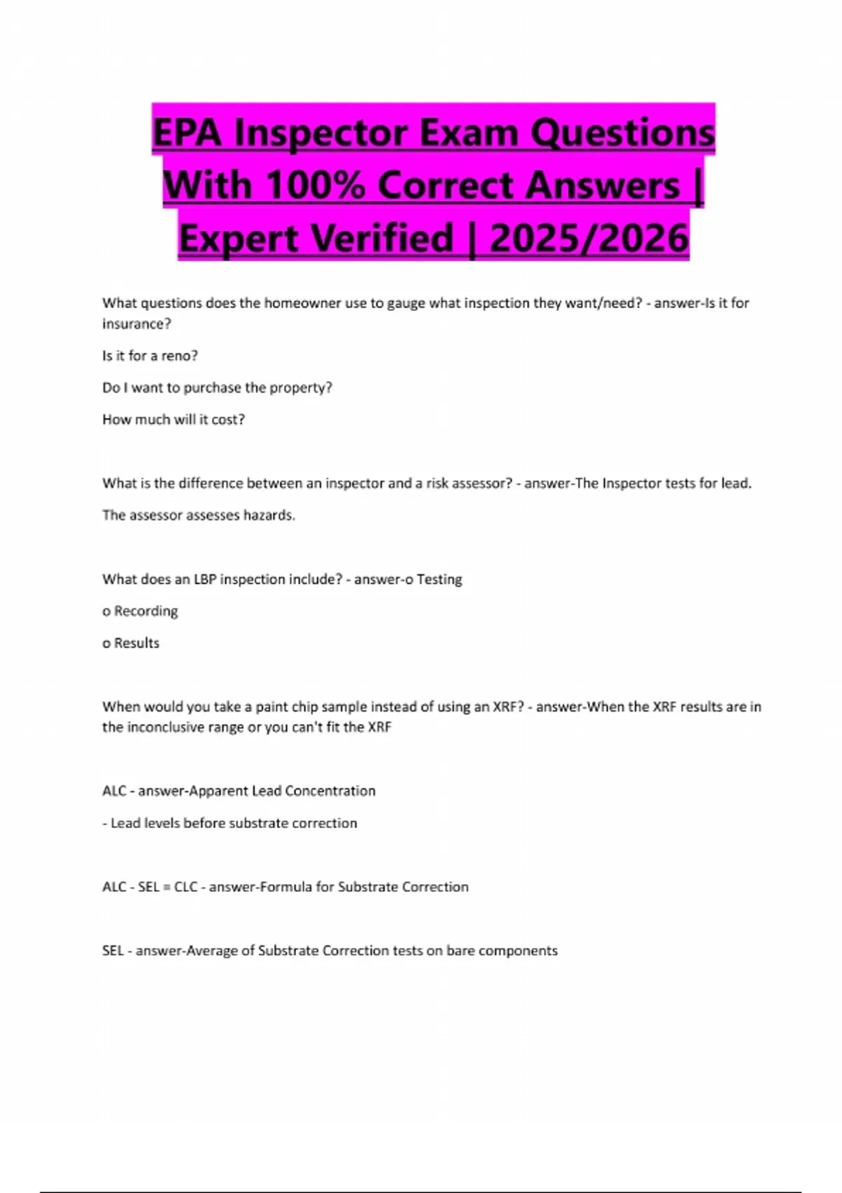 EPA Inspector Exam Questions With 100% Correct Answers | Expert Verified | 2025/2026 What questions does the homeowner use to gauge what inspection they want/need? - answer-Is it for insurance? Is it for a reno? Do I want to purchase the property? How much will it cost? What is the difference between an inspector and a risk assessor? - answer-The Inspector tests for lead. The assessor assesses hazards. What does an LBP inspection include? - answer-o Testing o Recording o Results When would you take a paint chip sample instead of using an XRF? - answer-When the XRF results are in the inconclusive range or you can't fit the XRF ALC - answer-Apparent Lead Concentration - Lead levels before substrate correction ALC - SEL = CLC - answer-Formula for Substrate Correction SEL - answer-Average of Substrate Correction tests on bare componentsXRF Fluorescence - answer-XRF uses a sealed source which shoots energy to the atoms, rattling them, and causing them to send energy back (FLUORESCENCE) which gives the XRF its reading XRF with Direct Reading - answer-All machines that use this need substrate correction (Spectrum analyzers)