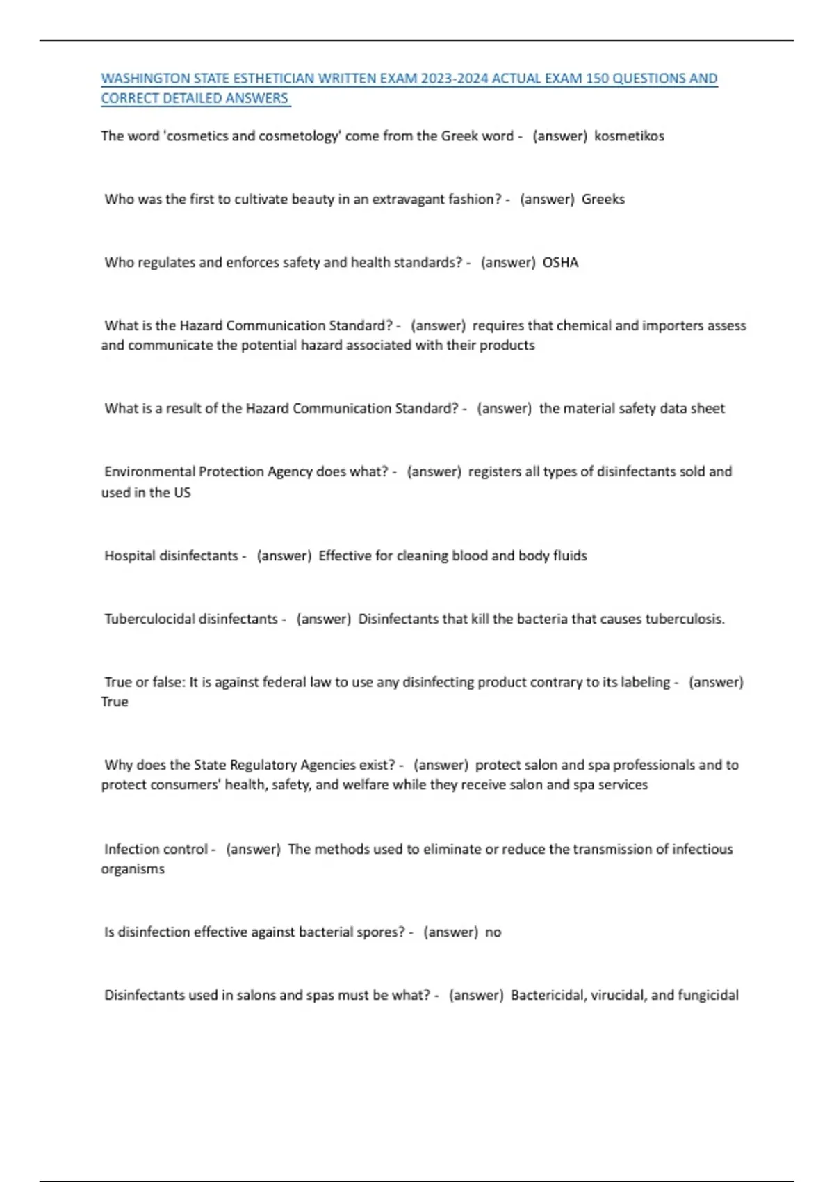 , WASHINGTON STATE ESTHETICIAN WRITTEN EXAM 2023-2024 ACTUAL EXAM 150 QUESTIONS AND