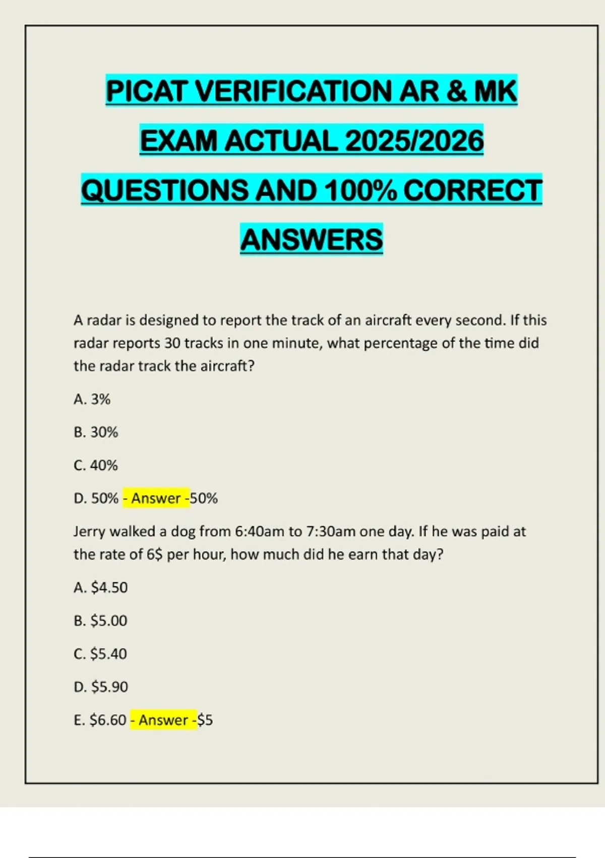 PICAT VERIFICATION AR & MK EXAM ACTUAL 2025/2026 QUESTIONS AND 100% CORRECT ANSWERS A radar is designed to report the track of an aircraft every second. If this radar reports 30 tracks in one minute, what percentage of the time did the radar track the aircraft? A. 3% B. 30% C. 40% D. 50% - Answer -50% Jerry walked a dog from 6:40am to 7:30am one day. If he was paid at the rate of 6$ per hour, how much did he earn that day? A. $4.50 B. $5.00 C. $5.40 D. $5.90 E. $6.60 - Answer -$5A woman is looking for a bigger square office. She finds an office twice the area of her current office. If the perimeter of her current office is 88 feet, how many square feet is the new office? A. 176 sq feet B. 352 sq feet C. 968 sq feet D. 1,200 sq feet - Answer -968 sq ft How many feet of chain fence are necessary to enclose a dog pen that is square and has an area of 64 square feet? A. 256 B. 64 C. 32 D. 16 - Answer -32 A train goes twice as fast downhill as it can go uphill, and 2/3 as fast uphill as it can go on level ground. If it goes 120 mph downhill, how long will it take to travel 45 miles on flat land? A. 1/2 hour B. 2/3 hour C. 1-1/2 hours D. 2 hours - Answer -1/2