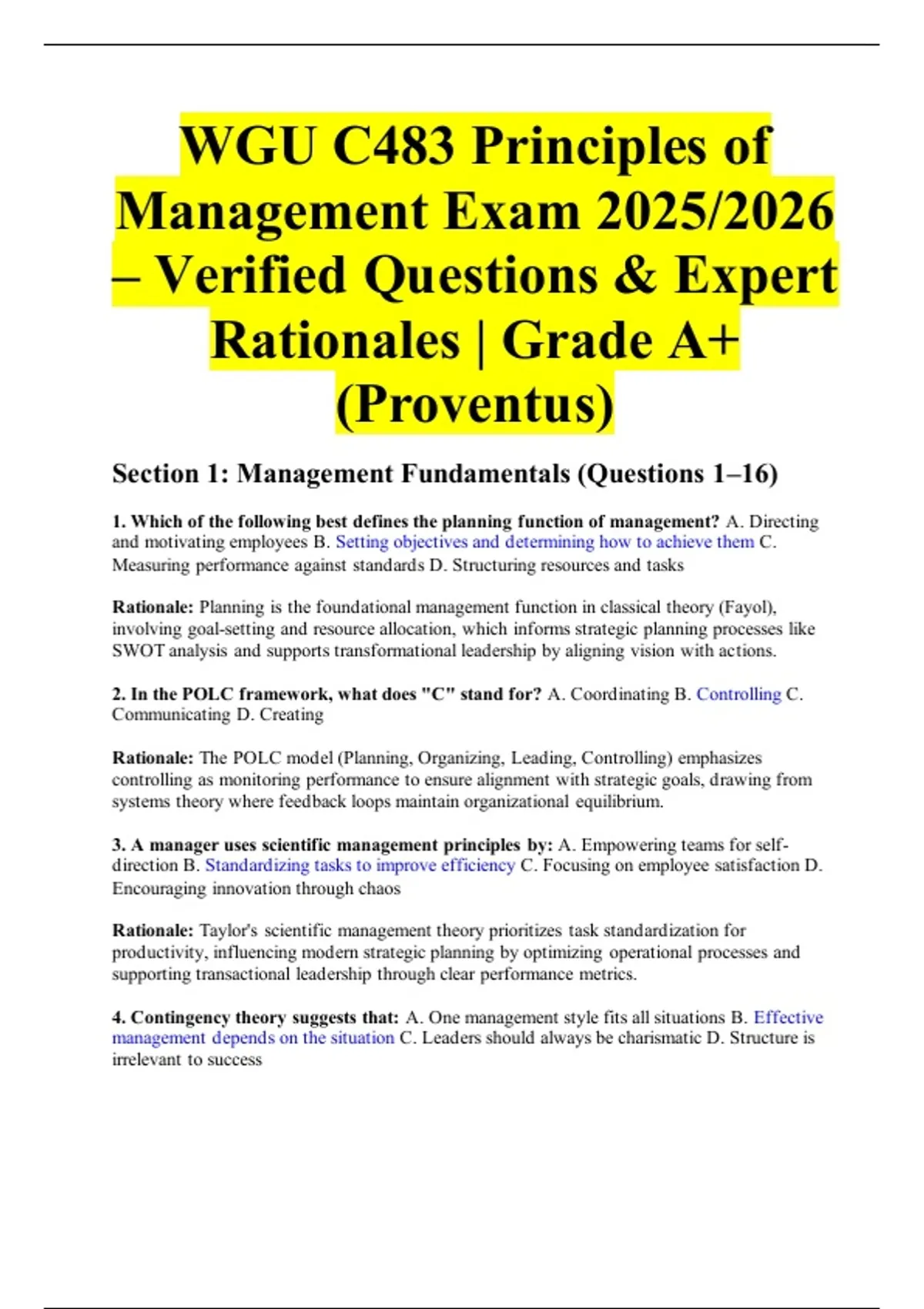 WGU C483 Principles of Management Exam 2025/2026 – Verified Questions & Expert Rationales | Grade A+ (Proventus)