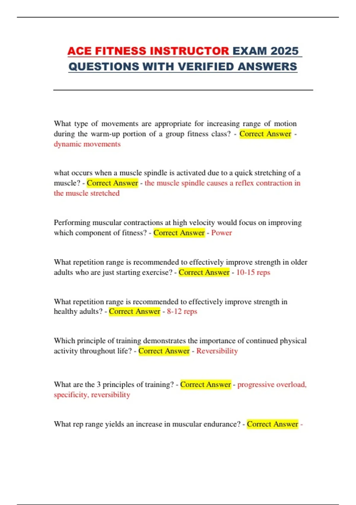 This document contains the full set of verified questions and answers for the 2025 ACE Fitness Instructor Exam. It comprehensively covers exercise science, biomechanics, anatomy, physiology, and instructional strategies relevant to group fitness instructors. The material also includes applied knowledge on program design, safety, cueing, behavioral coaching, and special population considerations. Ideal for exam preparation and quick revision before testing.