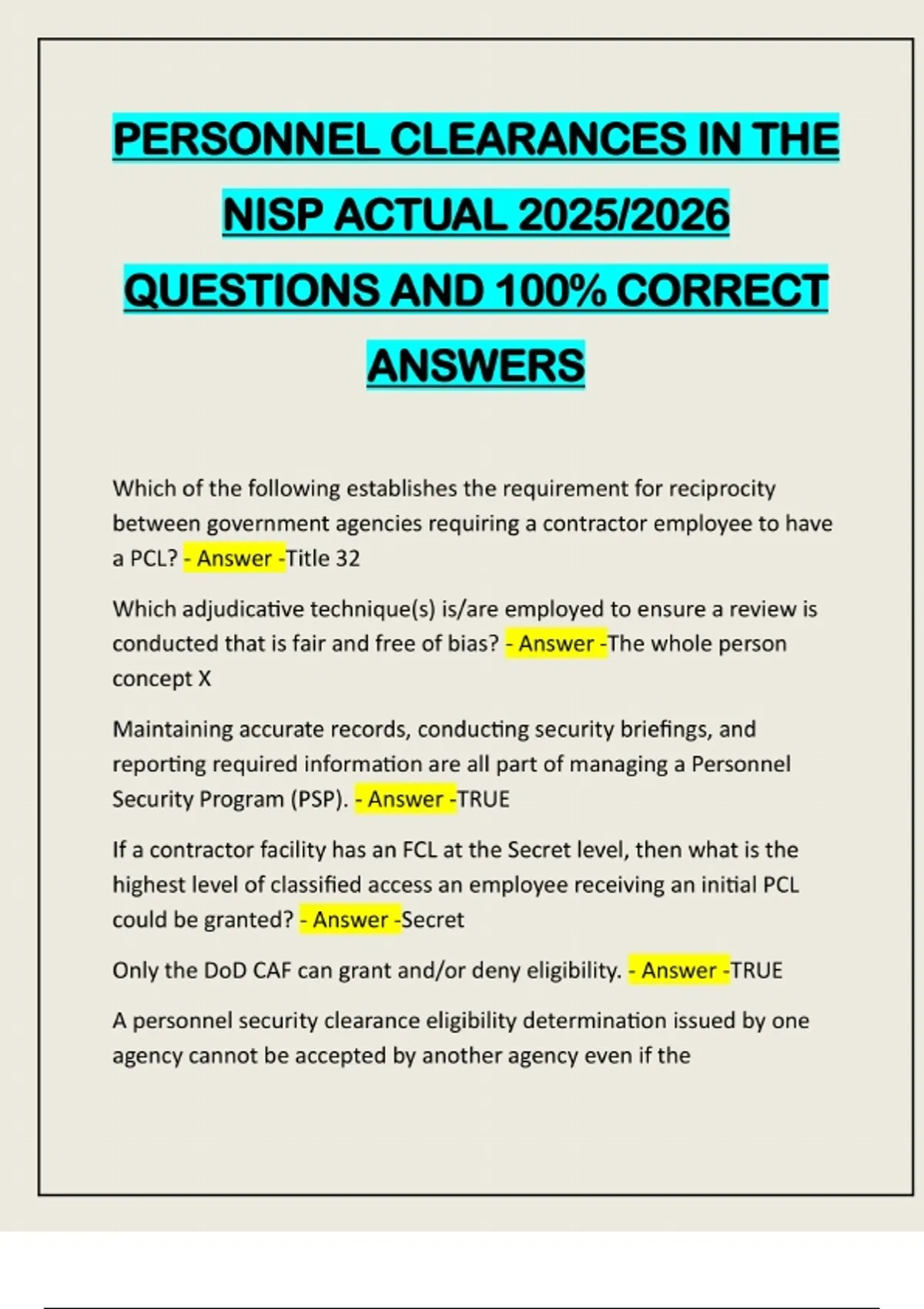 PERSONNEL CLEARANCES IN THE NISP ACTUAL 2025/2026 QUESTIONS AND 100% CORRECT ANSWERS Which of the following establishes the requirement for reciprocity between government agencies requiring a contractor employee to have a PCL? - Answer -Title 32 Which adjudicative technique(s) is/are employed to ensure a review is conducted that is fair and free of bias? - Answer -The whole person concept X Maintaining accurate records, conducting security briefings, and reporting required information are all part of managing a Personnel Security Program (PSP). - Answer -TRUE If a contractor facility has an FCL at the Secret level, then what is the highest level of classified access an employee receiving an initial PCL could be granted? - Answer -Secret Only the DoD CAF can grant and/or deny eligibility. - Answer -TRUE A personnel security clearance eligibility determination issued by one agency cannot be accepted by another agency even if the
