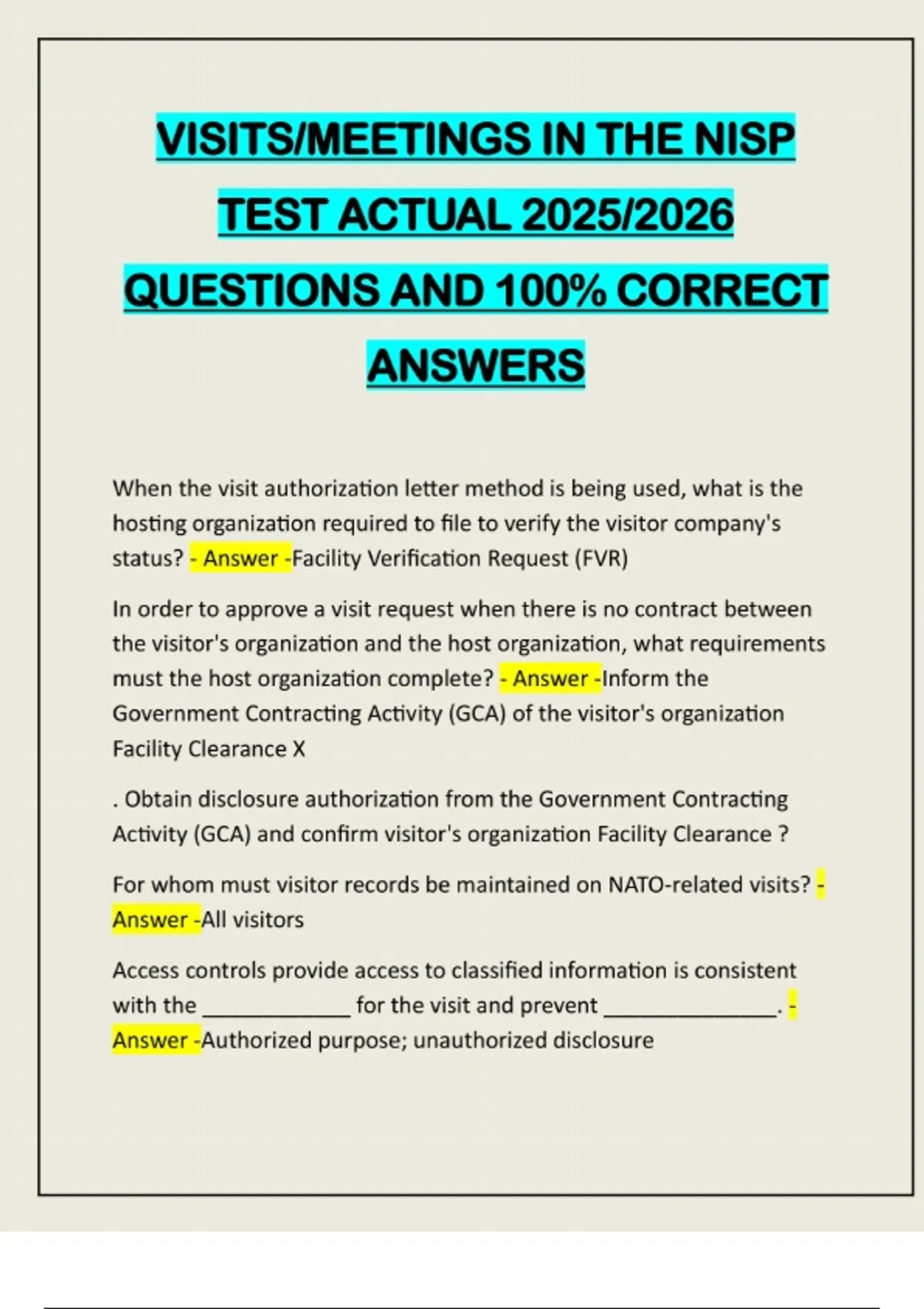 VISITS/MEETINGS IN THE NISP TEST ACTUAL 2025/2026 QUESTIONS AND 100% CORRECT ANSWERS When the visit authorization letter method is being used, what is the hosting organization required to file to verify the visitor company's status? - Answer -Facility Verification Request (FVR) In order to approve a visit request when there is no contract between the visitor's organization and the host organization, what requirements must the host organization complete? - Answer -Inform the Government Contracting Activity (GCA) of the visitor's organization Facility Clearance X . Obtain disclosure authorization from the Government Contracting Activity (GCA) and confirm visitor's organization Facility Clearance ? For whom must visitor records be maintained on NATO-related visits? - Answer -All visitors Access controls provide access to classified information is consistent with the ____________ for the visit and prevent ______________. - Answer -Authorized purpose; unauthorized disclosure