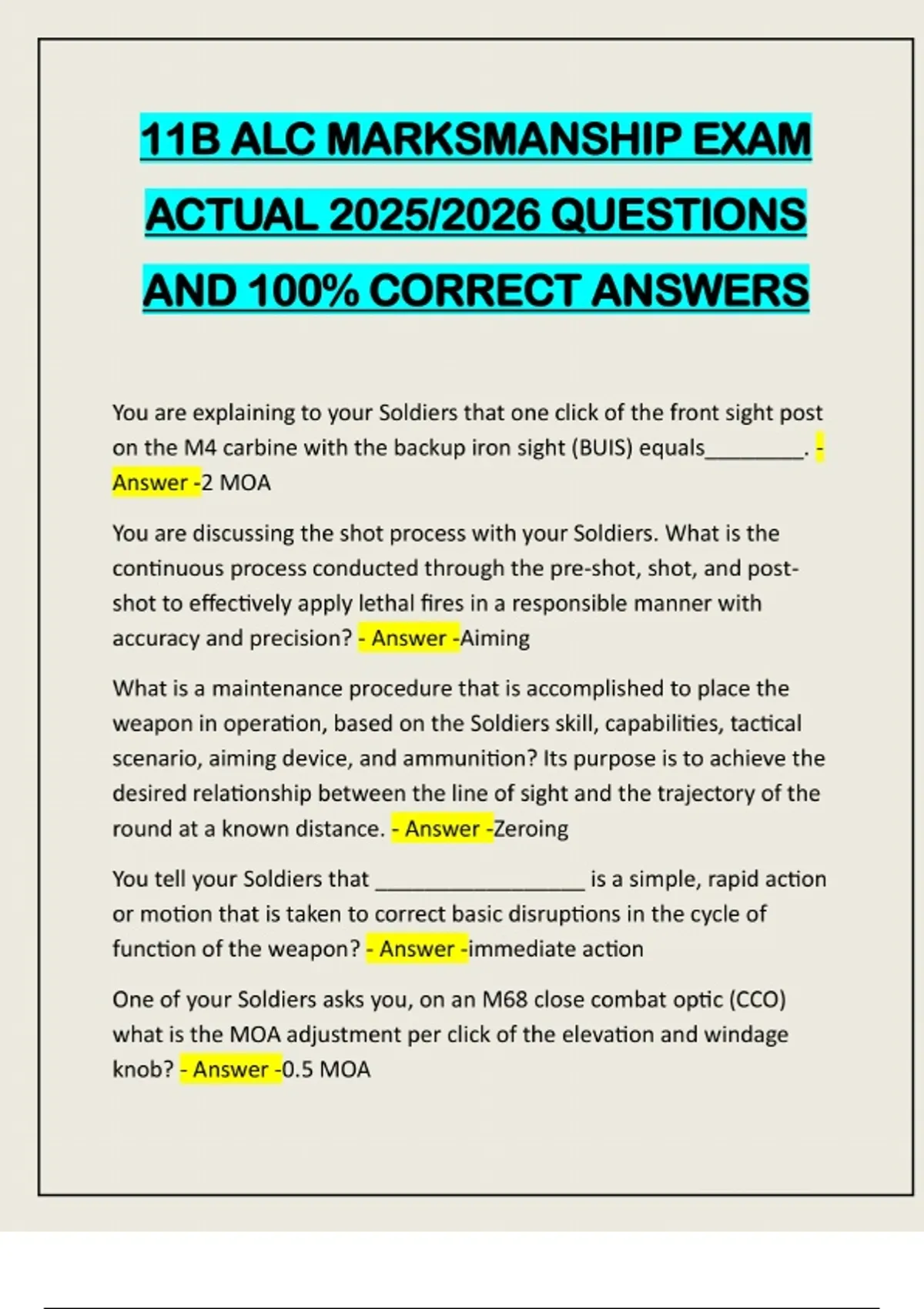 11B ALC MARKSMANSHIP EXAM ACTUAL 2025/2026 QUESTIONS AND 100% CORRECT ANSWERS You are explaining to your Soldiers that one click of the front sight post on the M4 carbine with the backup iron sight (BUIS) equals________. - Answer -2 MOA You are discussing the shot process with your Soldiers. What is the continuous process conducted through the pre-shot, shot, and postshot to effectively apply lethal fires in a responsible manner with accuracy and precision? - Answer -Aiming What is a maintenance procedure that is accomplished to place the weapon in operation, based on the Soldiers skill, capabilities, tactical scenario, aiming device, and ammunition? Its purpose is to achieve the desired relationship between the line of sight and the trajectory of the round at a known distance. - Answer -Zeroing You tell your Soldiers that _________________ is a simple, rapid action or motion that is taken to correct basic disruptions in the cycle of function of the weapon? - Answer -immediate action One of your Soldiers asks you, on an M68 close combat optic (CCO) what is the MOA adjustment per click of the elevation and windage knob? - Answer -0.5 MOAOn the rifle combat optic (RCO) when the eye is positioned to see the full field of view of the eyepiece, it is known as what? - Answer -Eye relief You are discussing malfunctions with your Soldiers and the corrective actions they can take to correct malfunctions. What corrective action is a skilled technique that must be applied to a specific problem or issue with the weapon that will not be corrected by taking immediate action? - Answer -Remedial Action You are discussing pre-shot, shot, and post-shot process with your Soldiers. You tell them that there is a level of attention allocated to each element during the shot process. Of the following, which is not an element in the shot phase of the shot process? - Answer -Position When a weapon fails to complete any phase of the cycle of function correctly, a ______________ has occurred. - Answer -malfunction You are discussing the Backup Iron Sight (BUIS) with your Soldiers. You tell them that the BUIS provides a backup capability effective up to what range? - Answer -600m What is the process of having another Soldier observe the firer during the firing process to look for shooting errors that the firer themselves may not consciously know they are making? - Answer -coaching You have been tasked to conduct marksmanship training for your platoon. What reference would you use to provide your Soldiers the critical information on their rifle or carbine to properly and effectively engage and destroy threats in a direct fire engagement? - Answer -TC 3- 22.9 Rifle and CarbineA Soldier applying their learned skills, employing their equipment, leveraging technology, and applying the proper force to create an unfair fight in favor of the Soldier is known as___________________. - Answer -Overmatch You are discussing common aiming errors with your Soldiers. You tell them that they may experience this error when failing to focus on the front sight post or reticle? - Answer -incorrect sight picture You tell your Soldiers that they can observe the movement of items in the environment downrange to determine the speed. You tell them that an estimated wind of 8-12 MPH is quantified by___________________________. - Answer -Raises dust and loose paper