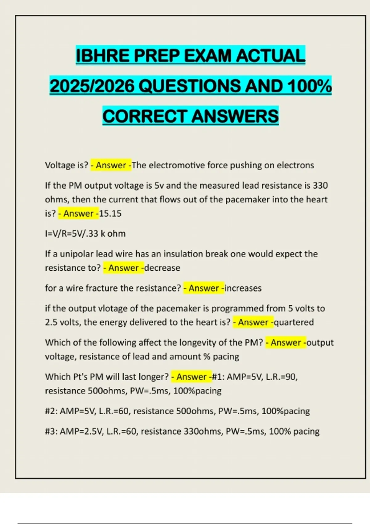 IBHRE PREP EXAM ACTUAL 2025/2026 QUESTIONS AND 100% CORRECT ANSWERS Voltage is? - Answer -The electromotive force pushing on electrons If the PM output voltage is 5v and the measured lead resistance is 330 ohms, then the current that flows out of the pacemaker into the heart is? - Answer -15.15 I=V/R=5V/.33 k ohm If a unipolar lead wire has an insulation break one would expect the resistance to? - Answer -decrease for a wire fracture the resistance? - Answer -increases if the output vlotage of the pacemaker is programmed from 5 volts to 2.5 volts, the energy delivered to the heart is? - Answer -quartered Which of the following affect the longevity of the PM? - Answer -output voltage, resistance of lead and amount % pacing Which Pt's PM will last longer? - Answer -#1: AMP=5V, L.R.=90, resistance 500ohms, PW=.5ms, 100%pacing #2: AMP=5V, L.R.=60, resistance 500ohms, PW=.5ms, 100%pacing #3: AMP=2.5V, L.R.=60, resistance 330ohms, PW=.5ms, 100% pacing