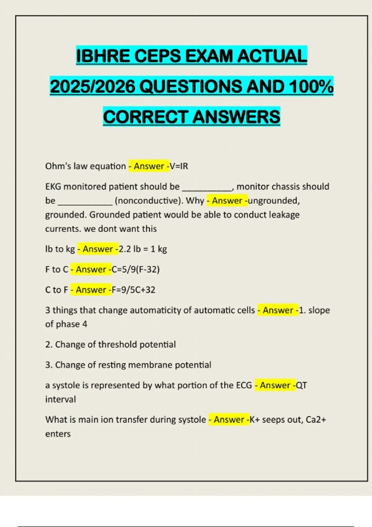IBHRE CEPS EXAM ACTUAL 2025/2026 QUESTIONS AND 100% CORRECT ANSWERS Ohm's law equation - Answer -V=IR EKG monitored patient should be __________, monitor chassis should be ___________ (nonconductive). Why - Answer -ungrounded, grounded. Grounded patient would be able to conduct leakage currents. we dont want this lb to kg - Answer -2.2 lb = 1 kg F to C - Answer -C=5/9(F-32) C to F - Answer -F=9/5C+32 3 things that change automaticity of automatic cells - Answer -1. slope of phase 4 2. Change of threshold potential 3. Change of resting membrane potential a systole is represented by what portion of the ECG - Answer -QT interval What is main ion transfer during systole - Answer -K+ seeps out, Ca2+ entersAt rest, what is intracellular/extracellular environment - Answer -inside negative, outside positive What phase of AP is resting membrane potential - Answer -phase 4 Nodal depolarization occurs via what channel - Answer -Ca2+ slow channel Cardiac muscle cell depol occurs via what channel - Answer -Na+ fast channel During which phases is cell refractory - Answer -1,2,3 TDP caused by what mechanism usually - Answer -EAD's (triggered activity) Variance - Answer -Take each number in sample, subtract each number from mean, square each difference, add all, divide sum by number in sample -1 Standard deviation - Answer -square root of variance P value - Answer -Probability of certainty / smaller p value means the more likely the result could not occur by chance survival curve showing % of patients surviving treatment over time - Answer -Kaplan - Meier curves when measuring EGM's, earliest atrial activation usually from _____ and earliest ventricular usually from ______ - Answer -P wave / QRS Morady maneuver is used to differentiate - Answer -differentiate AT from AVNRT/AVRT Most common arrhythmia - Answer -AFMost common SVT - Answer -AVNRT What type of single use devices can be resterilized and why? - Answer - Diagnostic EP electrodes because lumen and technically not a catheter because no lumen Fr to mm - Answer -1 Fr = .33 mm Tip inner diameter standard diagnostic cardiac catheters and why - Answer -.038 inch / because it is supposed to be used with .035-.038 inch guide wires What is 2 rules for CMC's like spiral or lasso - Answer -1. Only approved for use in LA due to chordae tendinea 2. Only rotate shaft clockwise