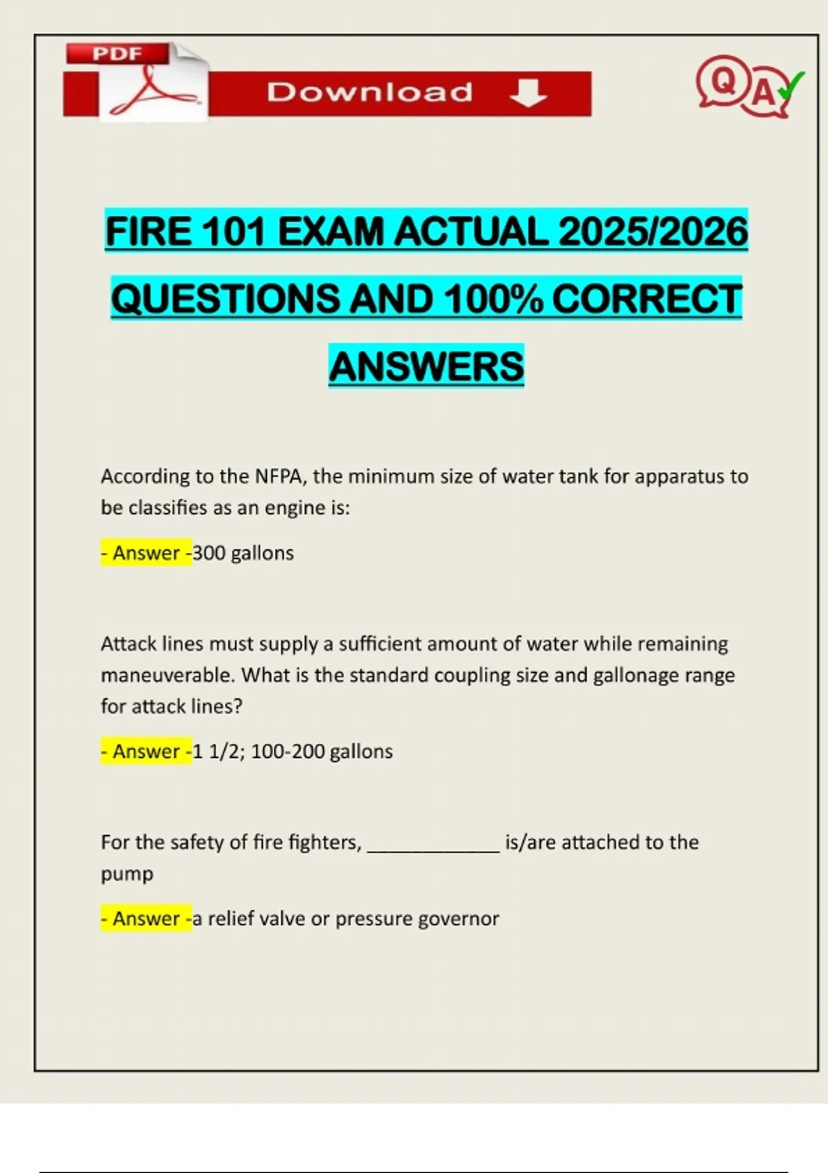 FIRE 101 EXAM ACTUAL 2025/2026 QUESTIONS AND 100% CORRECT ANSWERS According to the NFPA, the minimum size of water tank for apparatus to be classifies as an engine is: - Answer -300 gallons Attack lines must supply a sufficient amount of water while remaining maneuverable. What is the standard coupling size and gallonage range for attack lines? - Answer -1 1/2; 100-200 gallons For the safety of fire fighters, ____________ is/are attached to the pump - Answer -a relief valve or pressure governorNeed assistance on Online classes, Exams & Assignments? Reach out for instant help!! Full Course Assistance, Plagiarism-free Essay Writing, Research Paper, Dissertation, Discussion Posts, etc…. Confidential & Secure services. Tutors are available for all subjects! Email now at: Personal Protective Equipment (PPE) protects fire fighters in hazardous atmospheres. Which of the following is designed to protect fire fighters durning most building fires? - Answer -Structure fire PPE supply hose is designed to be laid out and not moved once full of water. What size of supply line can also be used as an attack line when necessary? - Answer -2 1/2 What is the main purpose of any pump - Answer -To lift water or ad