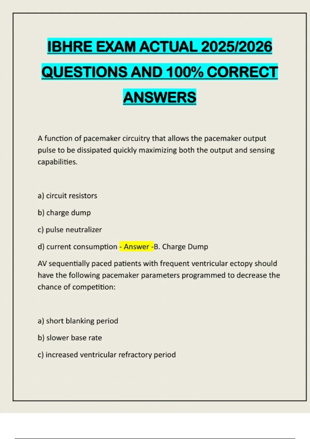 BHRE EXAM ACTUAL 2025/2026 QUESTIONS AND 100% CORRECT ANSWERS A function of pacemaker circuitry that allows the pacemaker output pulse to be dissipated quickly maximizing both the output and sensing capabilities. a) circuit resistors b) charge dump c) pulse neutralizer d) current consumption - Answer -B. Charge Dump AV sequentially paced patients with frequent ventricular ectopy should have the following pacemaker parameters programmed to decrease the chance of competition: a) short blanking period b) slower base rate c) increased ventricular refractory periodd) none of the above - Answer -A. Short Blanking Period Low threshold electrode materials include each of the following EXCEPT: a) iridium oxide b) elgiloy c) platinized platinum d) titanium nitride - Answer -B. Elgiloy The strength duration curve resulting in a parabolic shape is described by which of the following formulas? a) I x t b) I x V x t c) I x R d) all of the above - Answer -B. I x V x t The ventriculoatrial conduction time of a pacemaker patient with a typical endless-loop-tachycardia may be calculated by which equation? a) (upper rate limit interval) - ( AV delay + PVARP) b) (upper rate limit interval) - ( AV delay + PVARP + Wenckebach interval c) (lower rate limit interval) - ( upper rate limit interval)d) none of the above - Answer -D. None of the above Which of the following programmings would not prevent crosstalk? a) a prolonged blanking period b) "safety pacing" c) low atrial output d) less sensitive ventricular sensitivity - Answer -B. "Safety Pacing" The most commonly used battery chemistry in ICDs is: a) lithium thionyl chloride b) lithium manganese dioxide c) lithium silver vanadium oxide d) lithium manganese dioxide - Answer -C. Lithium Silver Vanadium Oxide The purpose of a capacitor in an electrical circuit is to: a) convert AC to DC current b) store electrical charge c) rapidly switch battery voltage on or offd) limit current flow to a single direction - Answer -B. Store Electrical Charge A programming mode that would NOT be utilized to manage intermittent atrial fibrillation in a patient with a DDD pacemaker is:. a) DDI b) DVI c) VDD d) VVI - Answer -C. VDD Variations in stimulus morphology on the surface ECG of an analog recorder may be caused by: a) a dislodged electrode b) an electrical short c) changes in patient position d) all of the above - Answer -D. All of the above All of the following have been used as ERI magnet responses except: a) abrupt increase in rate b) abrupt decrease in rate c) gradual increase in rate