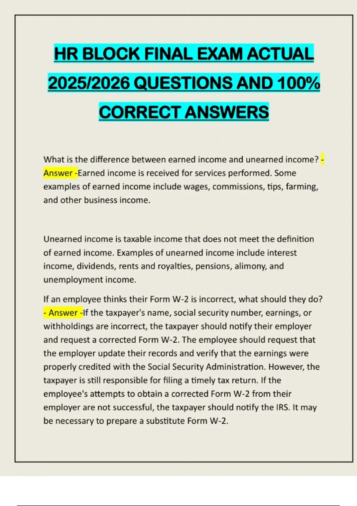 HR BLOCK FINAL EXAM ACTUAL 2025/2026 QUESTIONS AND 100% CORRECT ANSWERS What is the difference between earned income and unearned income? - Answer -Earned income is received for services performed. Some examples of earned income include wages, commissions, tips, farming, and other business income. Unearned income is taxable income that does not meet the definition of earned income. Examples of unearned income include interest income, dividends, rents and royalties, pensions, alimony, and unemployment income. If an employee thinks their Form W-2 is incorrect, what should they do? - Answer -If the taxpayer's name, social security number, earnings, or withholdings are incorrect, the taxpayer should notify their employer and request a corrected Form W-2. The employee should request that the employer update their records and verify that the earnings were properly credited with the Social Security Administration. However, the taxpayer is still responsible for filing a timely tax return. If the employee's attempts to obtain a corrected Form W-2 from their employer are not successful, the taxpayer should notify the IRS. It may be necessary to prepare a substitute Form W-2.Is interest received on U.S. Treasury obligations taxable on state and/or local returns? - Answer -No. Interest on U.S. Treasury obligations is exempt from state and local tax by federal law. Is municipal bond interest taxable on a federal return - Answer -No, the federal government does not tax municipal bond interest. How is interest income reported to the taxpayer? - Answer -Interest income is reported to the taxpayer on Form 1099-INT or a substitute statement. What information do you need to know to determine whether a nondependent taxpayer is required to file a return? - Answer -The taxpayer's filing status, age at the end of the tax year, and gross income for the year. For tax purposes, when is a person's marital status determined? - Answer -On the last day of the tax year, or the date of death. How much is added to the standard deduction if the taxpayer (or spouse) is age 65 or older, or blind? - Answer -$1,350 for married taxpayers and qualifying widow(er)s, or $1,700 for those filing single or head of household. What is the personal exemption amount for 2021 - Answer -There is no personal exemption for 2021. A personal exemption was an amount previously allowed by law to reduce income that would otherwise be taxed. The Tax Cuts and Jobs Act of 2017 repealed this deduction beginning in 2018. How is the gross income filing requirement determined for most nondependent taxpayers - Answer -The taxpayer's standard deduction,including the additional amounts for age. However, for married filing separately, or married filing jointly when the spouses did not live together at the end of the year, the amount is $5. What is the difference between injured spouse allocation and innocent spouse relief? - Answer -The IRS provides an injured spouse allocation for the taxpayer to protect their portion of a refund from a spouse's past-due federal income tax, unpaid student loans, unpaid child and spousal support, or state income tax. The IRS provides innocent spouse relief to taxpayers who file a joint return and later learn that their spouse has underestimated income (or overstated a credit or deduction) on the return.