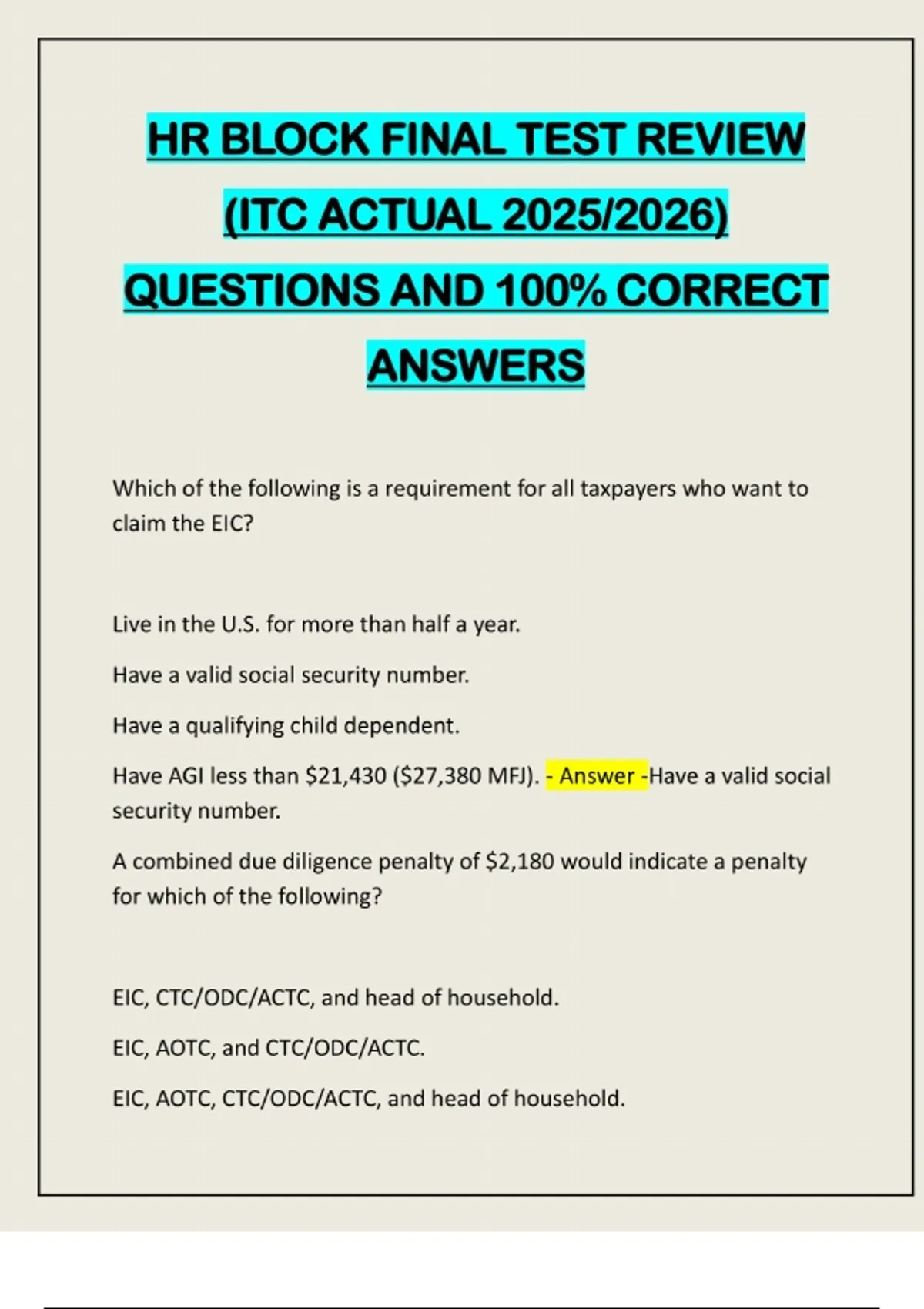 HR BLOCK FINAL TEST REVIEW (ITC ACTUAL 2025/2026) QUESTIONS AND 100% CORRECT ANSWERS Which of the following is a requirement for all taxpayers who want to claim the EIC? Live in the U.S. for more than half a year. Have a valid social security number. Have a qualifying child dependent. Have AGI less than $21,430 ($27,380 MFJ). - Answer -Have a valid social security number. A combined due diligence penalty of $2,180 would indicate a penalty for which of the following? EIC, CTC/ODC/ACTC, and head of household. EIC, AOTC, and CTC/ODC/ACTC. EIC, AOTC, CTC/ODC/ACTC, and head of household.EIC, PTC, CTC/ODC/ACTC, and head of household. - Answer -EIC, AOTC, CTC/ODC/ACTC, and head of household. When dependent care benefits are withheld from a taxpayer's income, where are they reported by the employer? Form 2441. Form 1040. Box 10 of Form W-2. The employer is not required to report them. - Answer -Box 10 of Form W-2. All of the following are due diligence requirements a tax preparer must meet for EIC, AOTC, CTC/ODC/ACTC, and HOH, EXCEPT: Investigate and verify the accuracy of information the taxpayer provides to show eligibility for EIC, AOTC, CTC/ODC/ACTC, and HOH. Complete all worksheets used to compute the credits. If the worksheet is completed by hand, keep a copy in the taxpayer's client file. Maintain a copy of documents provided by the taxpayer that the tax preparer relied on when determining credit eligibility. Then record the date the information was obtained and the name of who provided the information.When information provided by the taxpayer appears to be incorrect, inconsistent, or incomplete, the tax preparer must make additional inquiries to determine if the taxpayer is eligible for the benefit. Then document both the questions asked and responses provided. - Answer - Investigate and verify the accuracy of information the taxpayer provides to show eligibility for EIC, AOTC, CTC/ODC/ACTC, and HOH. When a taxpayer receives Form 1099-R with no am