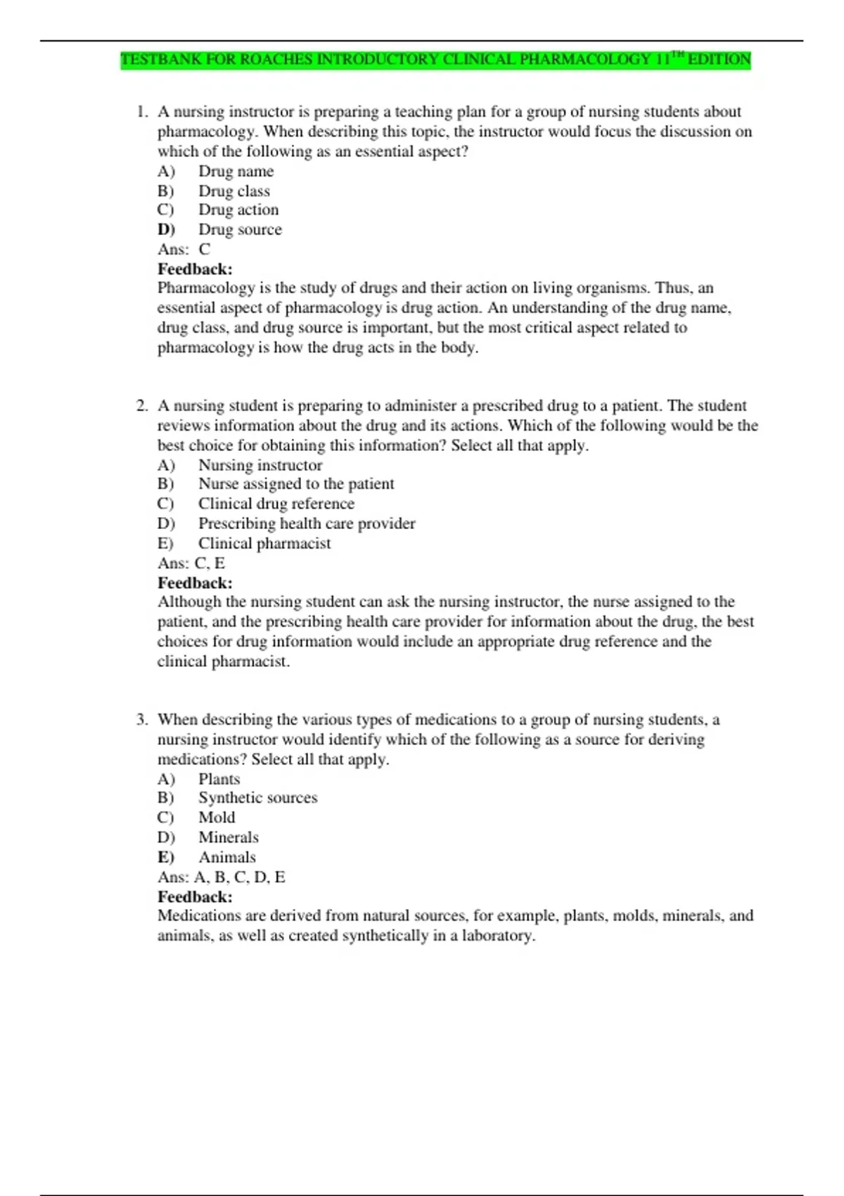 TESTBANK FOR ROACHES INTRODUCTORY CLINICAL PHARMACOLOGY 11TH EDITION
