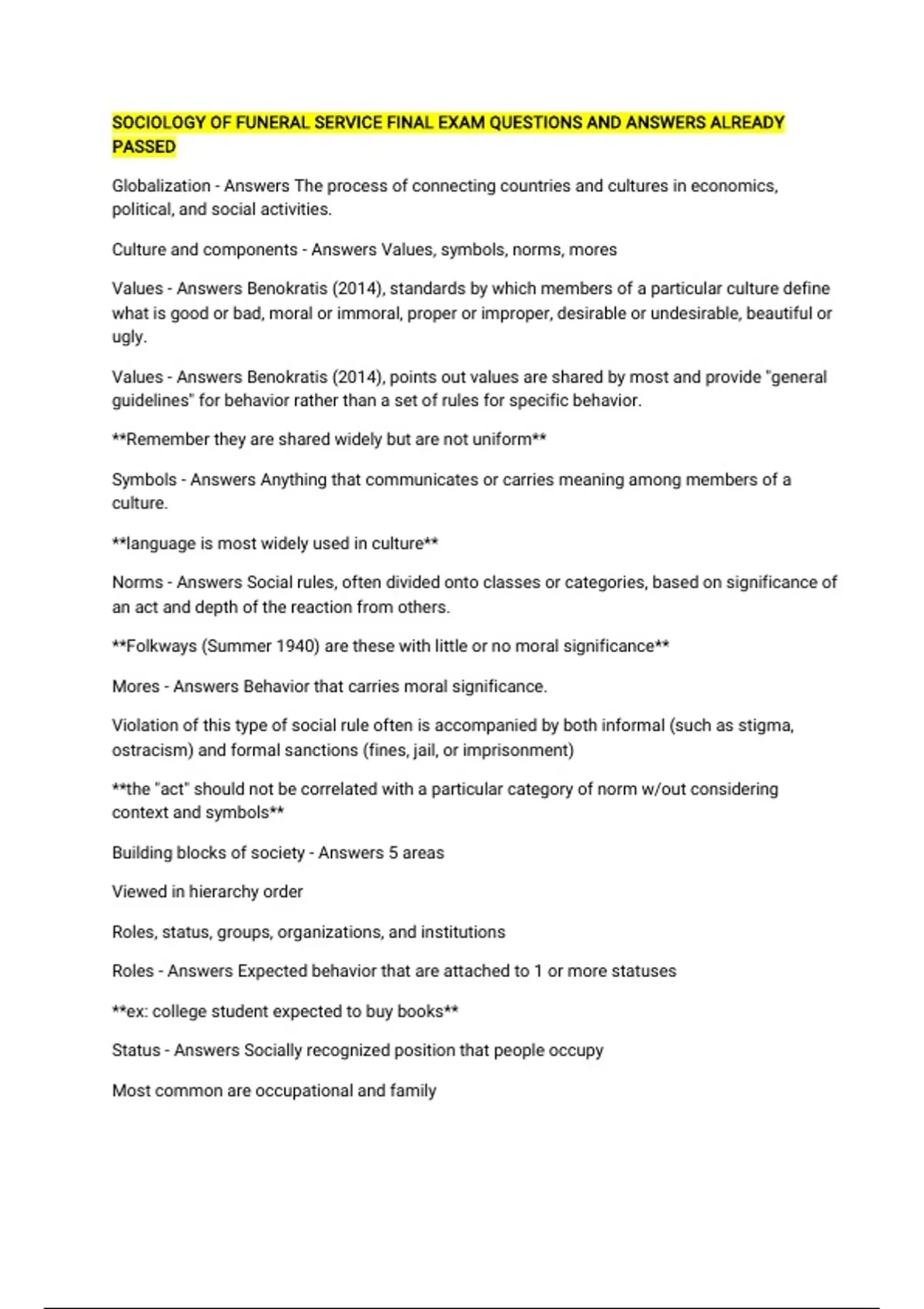 SOCIOLOGY OF FUNERAL SERVICE FINAL EXAM QUESTIONS AND ANSWERS ALREADY PASSED Globalization - Answers The process of connecting countries and cultures in economics, political, and social activities. Culture and components - Answers Values, symbols, norms, mores Values - Answers Benokratis (2014), standards by which members of a particular culture define what is good or bad, moral or immoral, proper or improper, desirable or undesirable, beautiful or ugly. Values - Answers Benokratis (2014), points out values are shared by most and provide "general guidelines" for behavior rather than a set of rules for specific behavior. **Remember they are shared widely but are not uniform** Symbols - Answers Anything that communicates or carries meaning among members of a culture. **language is most widely used in culture** Norms - Answers Social rules, often divided onto classes or categories, based on significance of an act and depth of the reaction from others. **Folkways (Summer 1940) are these with little or no moral significance** Mores - Answers Behavior that carries moral significance. Violation of this type of social rule often is accompanied by both informal (such as stigma, ostracism) and formal sanctions (fines, jail, or imprisonment) **the "act" should not be correlated with a particular category of norm w/out considering context and symbols** Building blocks of society - Answers 5 areas Viewed in hierarchy order Roles, status, groups, organizations, and institutions Roles - Answers Expected behavior that are attached to 1 or more statuses **ex: college student expected to buy books** Status - Answers Socially recognized position that people occupy Most common are occupational and family **ex: Dr, dentist, mother, father** Social group - Answers 2 or more ppl who engage in meaningful interaction. **Primary (Cooley 1909) such as a family, is contrasted to a secondary group whose goal is to achieve some task, such as a work group** Organizations - Answers Viewed as formal entities that are created to achieve some goal ** FH both corporate and privately owned** Institution - Answers Most abstract of building blocks Purpose and function served in society Full of statuses and roles Industrialization - Answers The process by which a society transforms from a primarily agricultural adaptive strategy (economy) to the manufacturing of goods and services through advanced technical enterprises. Division of labor - Answers One of the consequences of industrialization is more complex division of labor in the manner in which goods are produced. Growth of middle class - Answers As good and services became more plentiful and less expensive in mass productions, more ppl are able to afford more goods and services. **also social variables such as politics, values, social movements** (schlesinger 2011) the work of labor unions pressed for higher wages and better work conditions Leisure - Answers In 1900, more than 40% of our population was dedicated to food production. Today less than 2% dedicated to food production. Post-Industrialization - Answers A type of adaptive strategy (economy) that is based on high-tech (computers) and information rather than the production of goods. Most products are imported from China, Mexico, Korea, India, etc., due to lower production costs Urbanization - Answers Involves living patterns that reflect a high density of people I a relatively bounded space. Ex: in US 1920 marks the year when more people lived in urban than rural areas. **role playing tends to be prompted by self-interest rather than the interest of kinship (Tonnies 1963)