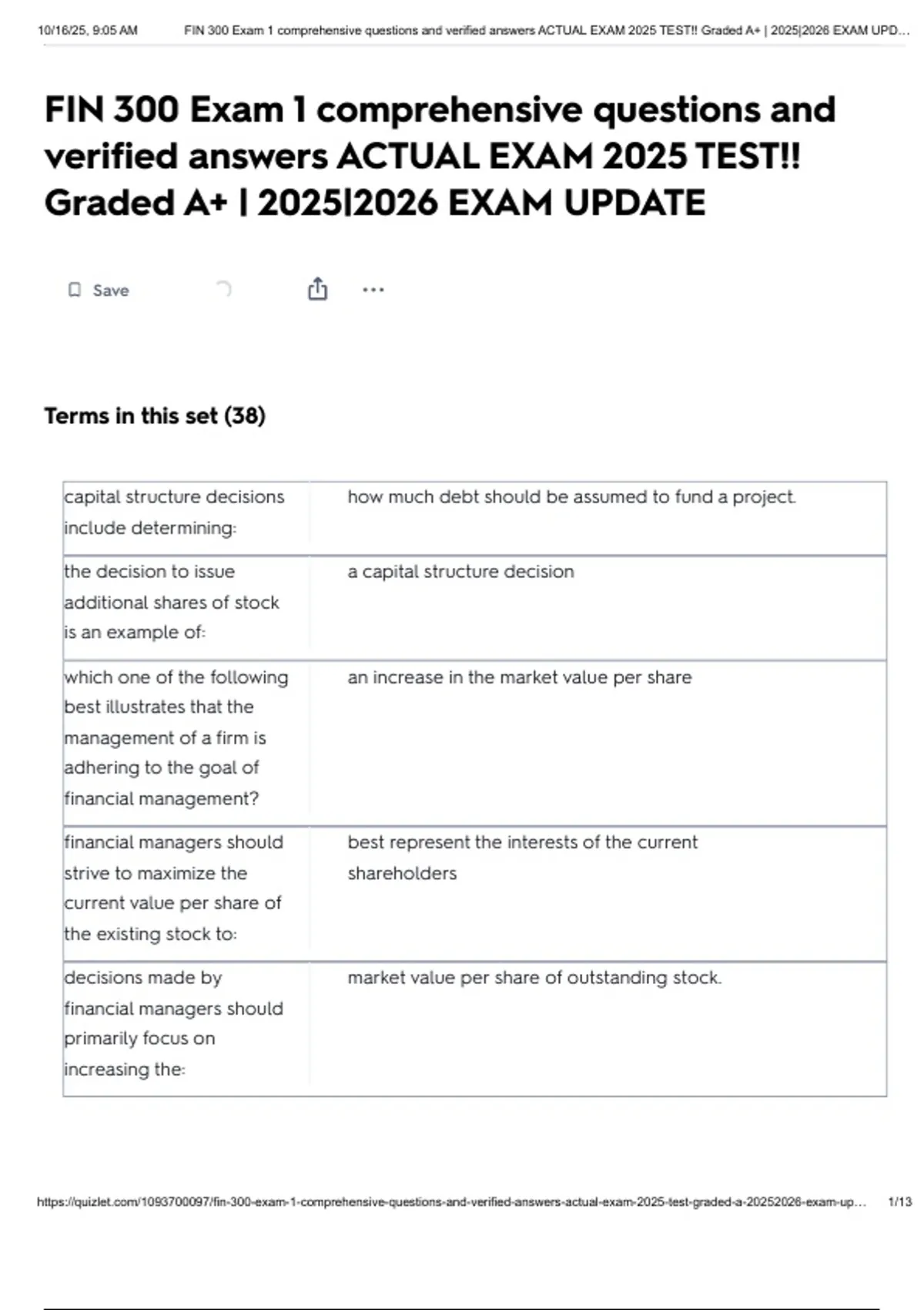 10/16/25, 9:05 AM FIN 300 Exam 1 comprehensive questions and verified answers ACTUAL EXAM 2025 TEST!! Graded A+ | 2025|2026 EXAM UPD…