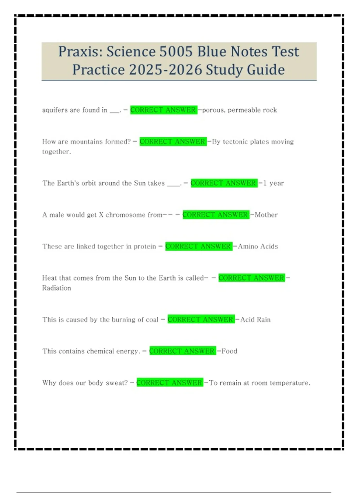 Praxis: Science 5005 Blue Notes Test Practice Study Guide