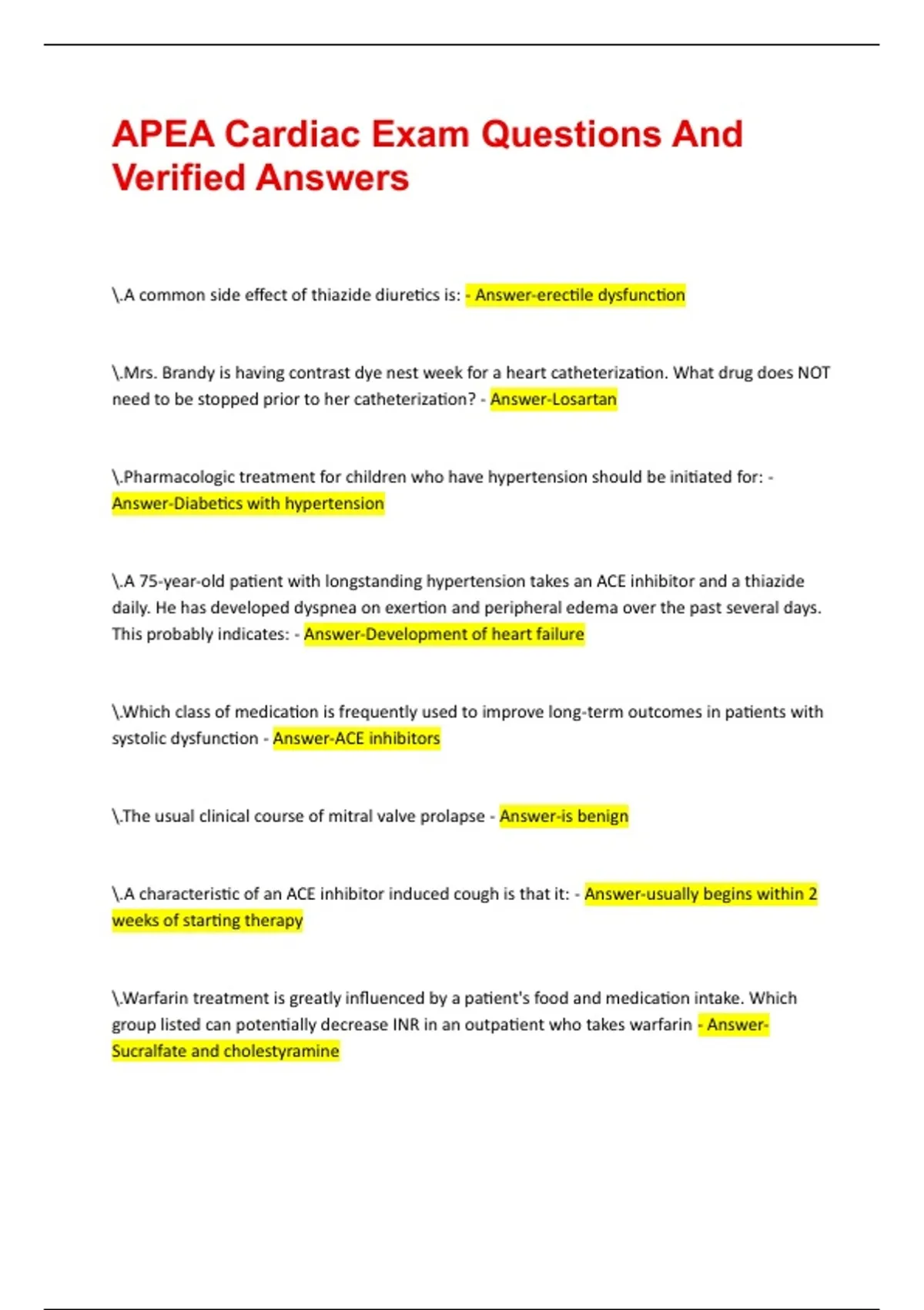 APEA Cardiac Exam Questions And Verified Answers .A common side effect of thiazide diuretics is: - Answer-erectile dysfunction .Mrs. Brandy is having contrast dye nest week for a heart catheterization. What drug does NOT need to be stopped prior to her catheterization? - Answer-Losartan .Pharmacologic treatment for children who have hypertension should be initiated for: - Answer-Diabetics with hypertension .A 75-year-old patient with longstanding hypertension takes an ACE inhibitor and a thiazide daily. He has developed dyspnea on exertion and peripheral edema over the past several days. This probably indicates: - Answer-Development of heart failure .Which class of medication is frequently used to improve long-term outcomes in patients with systolic dysfunction - Answer-ACE inhibitors .The usual clinical course of mitral valve prolapse - Answer-is benign .A characteristic of an ACE inhibitor induced cough is that it: - Answer-usually begins within 2 weeks of starting therapy .Warfarin treatment is greatly influenced by a patient's food and medication intake. Which group listed can potentially decrease INR in an outpatient who takes warfarin - Answer-Sucralfate and cholestyramine .A 77-year-old patient has had an increase in blood pressure since the last exam. THe blood pressure readings are provided. If medication is to be started on this patient, what would be a good first choice: BP: 144/90 to 168/88 - Answer-Calcium channel blocker .The carotid arteries are auscultated for bruits because: - Answer-this is indicative of generalized atherosclerosis .A decrease in blood pressure can occur in men who take sildenafil (Viagra) and: - Answer-any antihypertensive medication .A 74-year-old who retired as a store clerk last year would like to start an exercise program. She tells the nurse practitioner that she would like to start walking 15-20 min daily. Which statement is correct regarding the patient - Answer-She does not need any testing because she is asymptomatic .Which medication listed below could potentially exacerbate heart failure in a susceptible patient - Answer-Metoprolol .Mr. Brown a 45-year old African American male has the following lab values. What should the NP do next: LDL 180 HDL 37 Cholesterol 250 Triglycerides 140 - Answer-A thyroid stimulating hormone (TSH) level .According to the national heart, lung and blood institute, which characteristic listed below is a coronary heard disease risk equivalent; that is, which risk factor places the patient at a CHD risk similar to a history of CHD - Answer-Diabetes mellitus