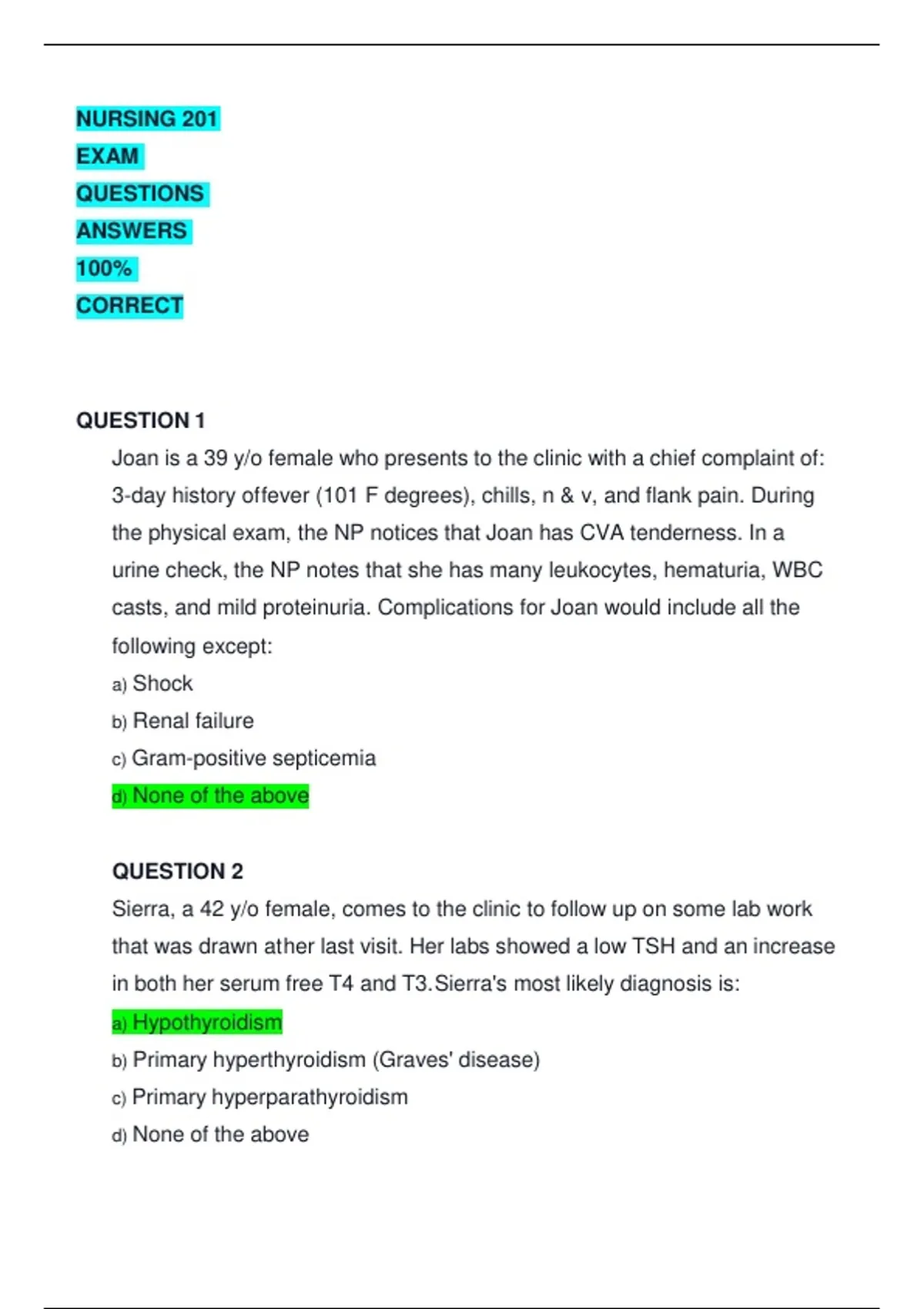 Prepare confidently with the NURSING 201 Exam Questions and Answers — a 100% verified and accurate study resource designed to help you achieve top results. This updated 2025/2026 version includes real exam-style questions, correct answers, and clear explanations covering essential nursing concepts, clinical reasoning, patient care, and safety principles. Perfect for nursing students and exam preparation, this resource ensures a thorough understanding of core nursing topics while improving test performance and confidence. Ideal for anyone taking NURSING 201 or equivalent foundational nursing exams