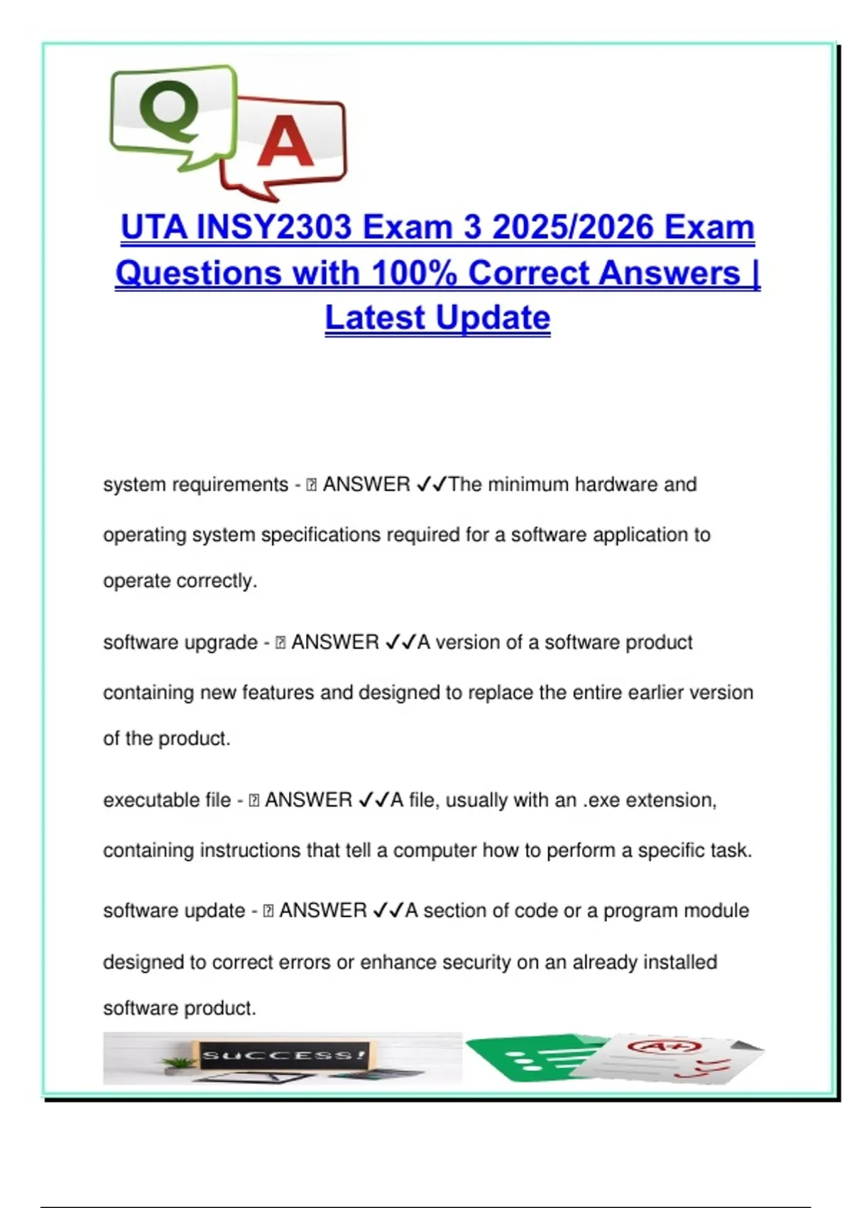 This document contains over 60 multiple-choice questions and correct answers from Exam 3 of INSY 2303 – Introduction to Information Systems at the University of Texas at Arlington (UTA), prepared for the 2025/2026 academic year. It offers a focused review of intermediate-level concepts essential to understanding how digital systems support modern businesses, with an emphasis on practical technology knowledge relevant to real-world IT environments. Key areas covered include: E-Commerce and Online Business Models: B2B, B2C, C2C, e-tailing strategies, and payment processing Computer Networks and Internet Protocols: IP addressing, MAC addresses, DHCP, TCP/IP stack, and DNS Wireless and Mobile Technologies: Wi-Fi standards, mobile commerce, Bluetooth, network configurations Cybersecurity Essentials: Malware types, authentication protocols, firewalls, phishing, secure transactions Cloud Technologies and Internet Infrastructure: SaaS, IaaS, broadband, fiber optics, bandwidth management Data Communication Tools: Instant messaging, VoIP, file transfer protocols, peer-to-peer systems Digital Identity and Encryption: Digital certificates, PKI, VPN, and authentication methods Each question is crafted in the format used for actual UTA exams and includes the correct answer for immediate feedback and comprehension. It is especially useful for students reviewing for midterm exams, project-based assessments, or final exam prep across information systems disciplines. Recommended for students in: – Management Information Systems (MIS) – Information Systems & Business IT programs – Computer Science and Technology Support tracks – Engineering majors with a focus on IT infrastructure – Enrolled at UTA or other US universities offering IS foundations This resource is ideal for mastering the core IT frameworks behind today’s enterprise systems and internet-based technologies. Keywords: INSY 2303 exam, UTA IS course, e-commerce types, networking basics, cybersecurity, TCP IP, DNS, MAC address, broadband, cloud computing, data transmission, SaaS, VPN, digital certificate, MIS exam prep, University of Texas Arlington