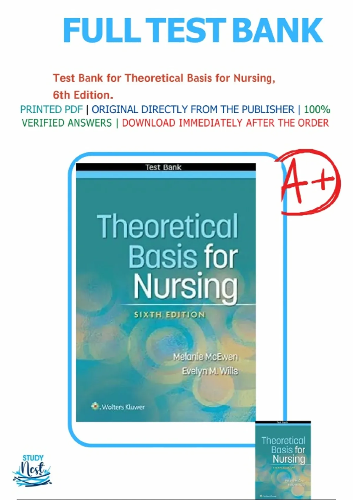 Test Bank for Theoretical Basis for Nursing, 6th Edition by McEwen & Wills offers a comprehensive and accurate collection of questions designed to help students and educators deepen their understanding of nursing theories, models, and conceptual frameworks. Each question aligns precisely with textbook objectives and focuses on the development, evaluation, and application of nursing theory in practice, research, and education. The content promotes critical analysis and integration of theoretical principles into clinical decision-making and evidence-based care. With a mix of multiple-choice, application-based, and scenario-style questions, this test bank equips learners with the intellectual tools to understand how theory informs nursing science and guides professional judgment. All items have been verified and updated for accuracy, ensuring relevance to the 6th edition. This is the ideal companion for both undergraduate and graduate students pursuing advanced nursing theory courses and for instructors developing robust exam materials.