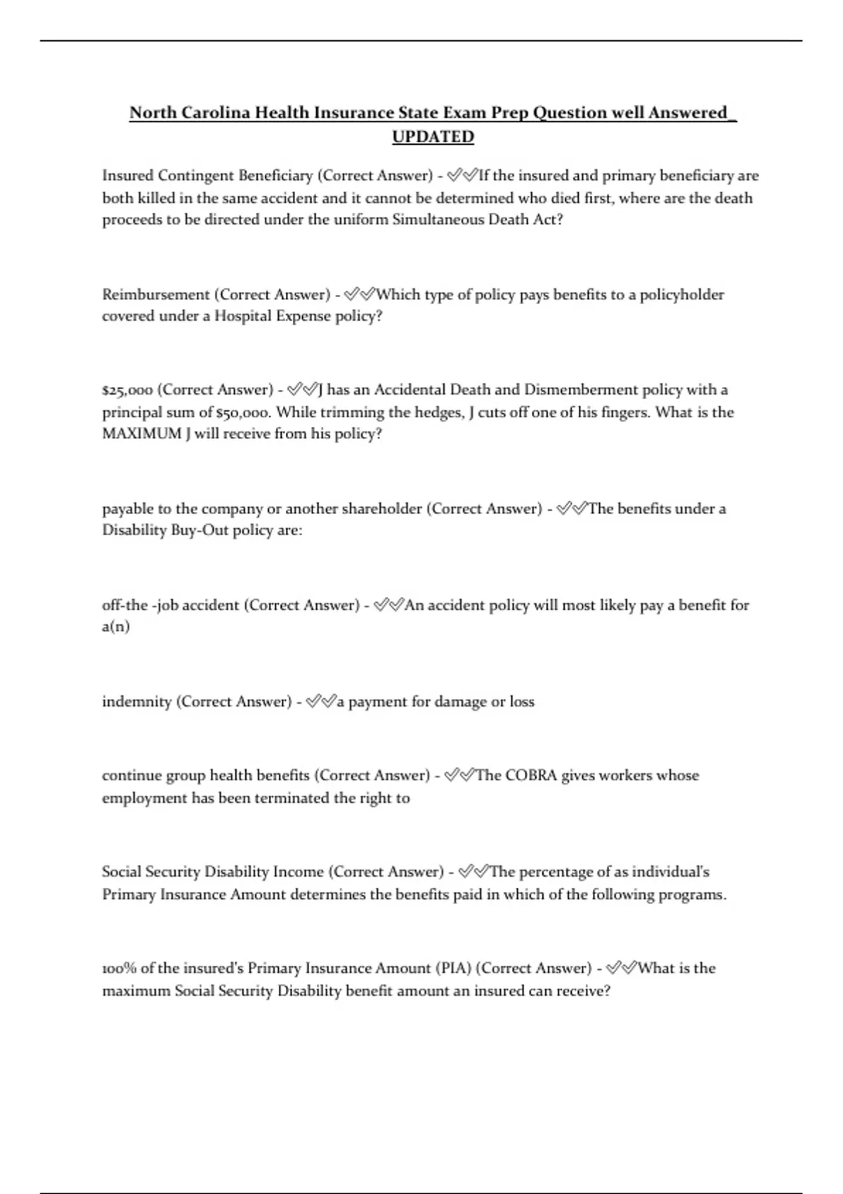 North Carolina Health Insurance State Exam Prep Question well Answered_ UPDATED