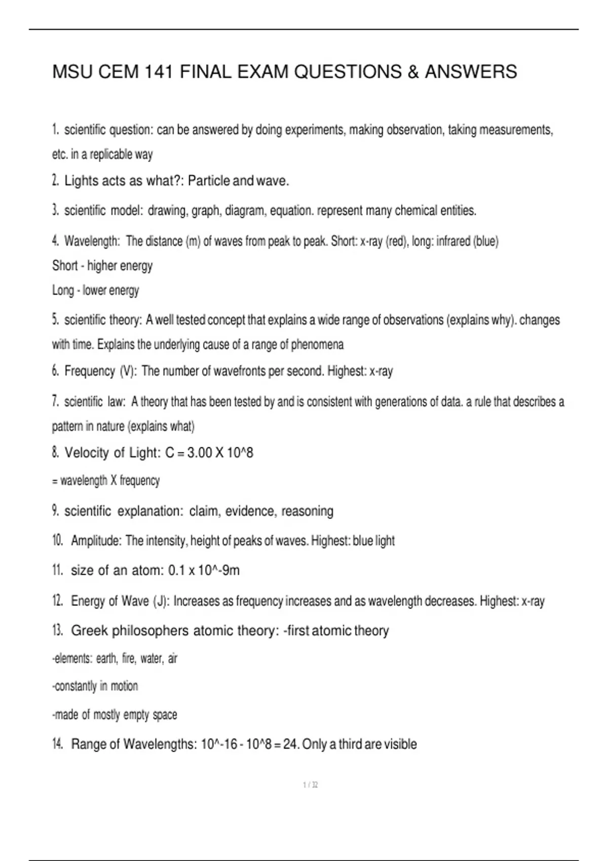 MSU CEM 141 FINAL EXAM QUESTIONS & ANSWERS