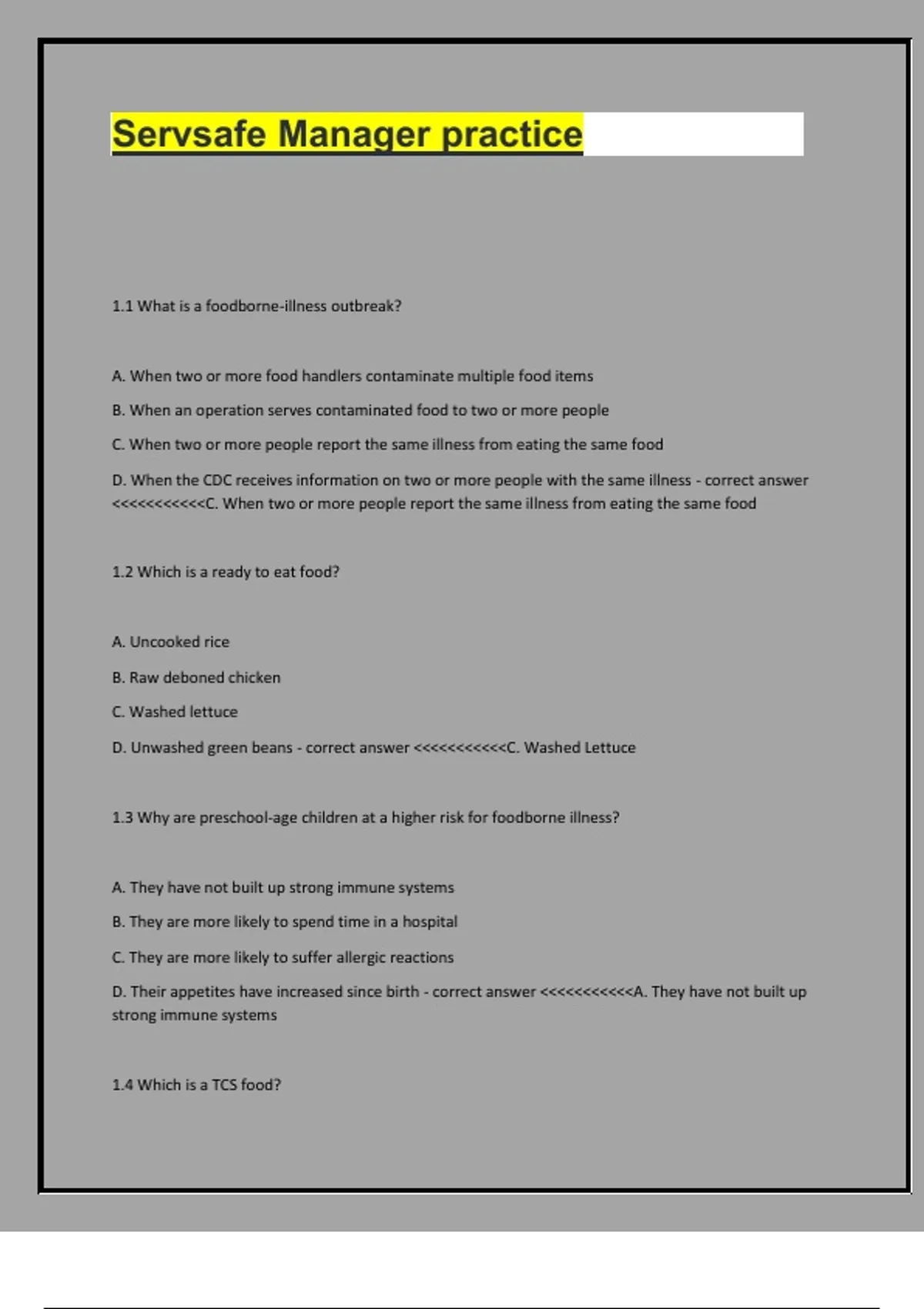 , D. Food requiring time and temperature control for safety - correct answer <<<<<<<<<<<D. Food