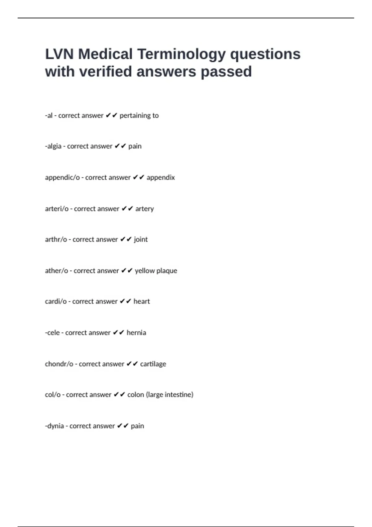 LVN Medical Terminology questions with verified answers passed