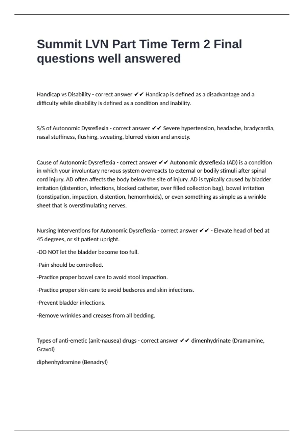 Nursing Interventions for Autonomic Dysreflexia - correct answer ✔✔ - Elevate head of bed at