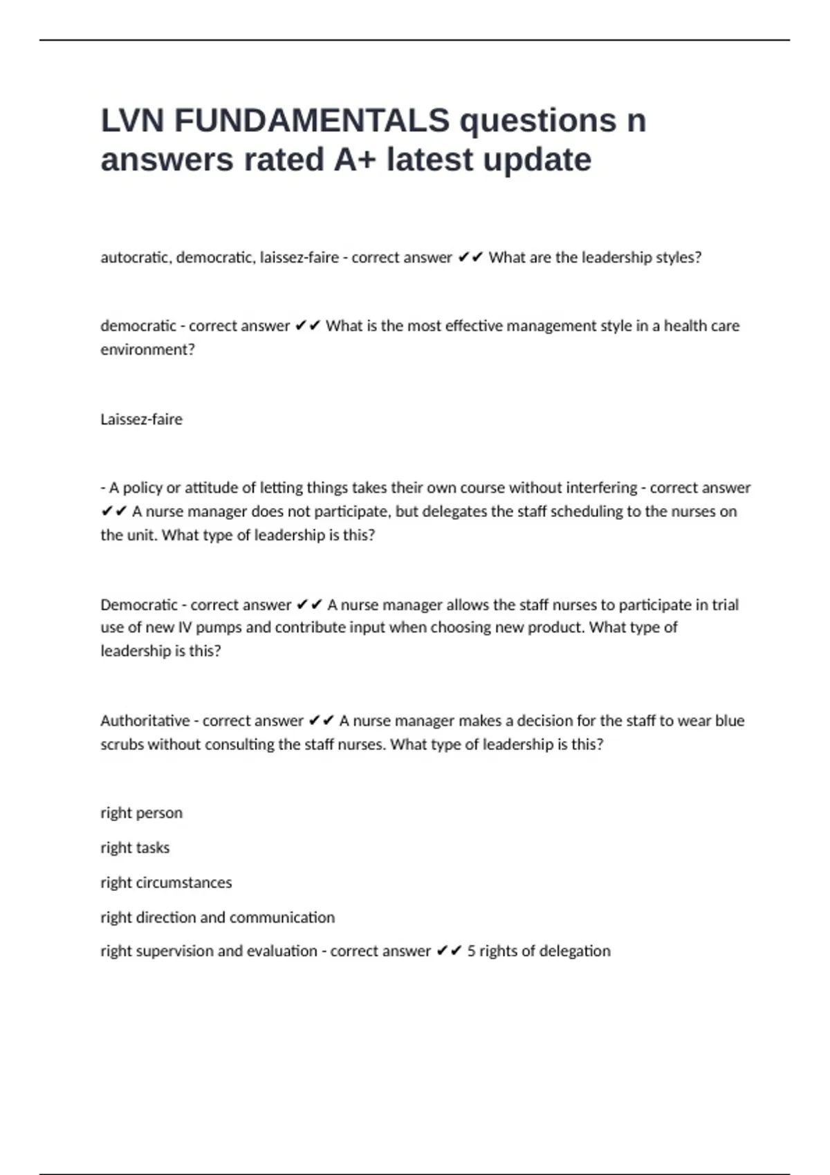 Democratic - correct answer ✔✔ A nurse manager allows the staff nurses to participate in trial