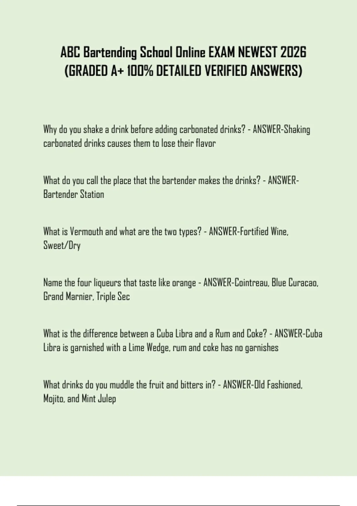 Master your ABC Bartending School Online Exam 2026 with this A+ graded, 100% verified, and fully updated answer guide, designed to help you achieve top results and complete your bartender certification with confidence. This comprehensive and verified 2026 version includes detailed, accurate, and up-to-date answers covering every topic in the ABC Bartending School online curriculum. Learn everything you need to pass — including mixology techniques, drink recipes, bar measurements, customer service, responsible alcohol service, and state regulations. Each question is crafted and reviewed for accuracy, ensuring alignment with the 2026 ABC Bartending School exam format and current bartending standards. Perfect for students completing their online bartender certification, this verified and graded resource provides the knowledge and confidence you need to pass your ABC Bartending School exam on your first try.