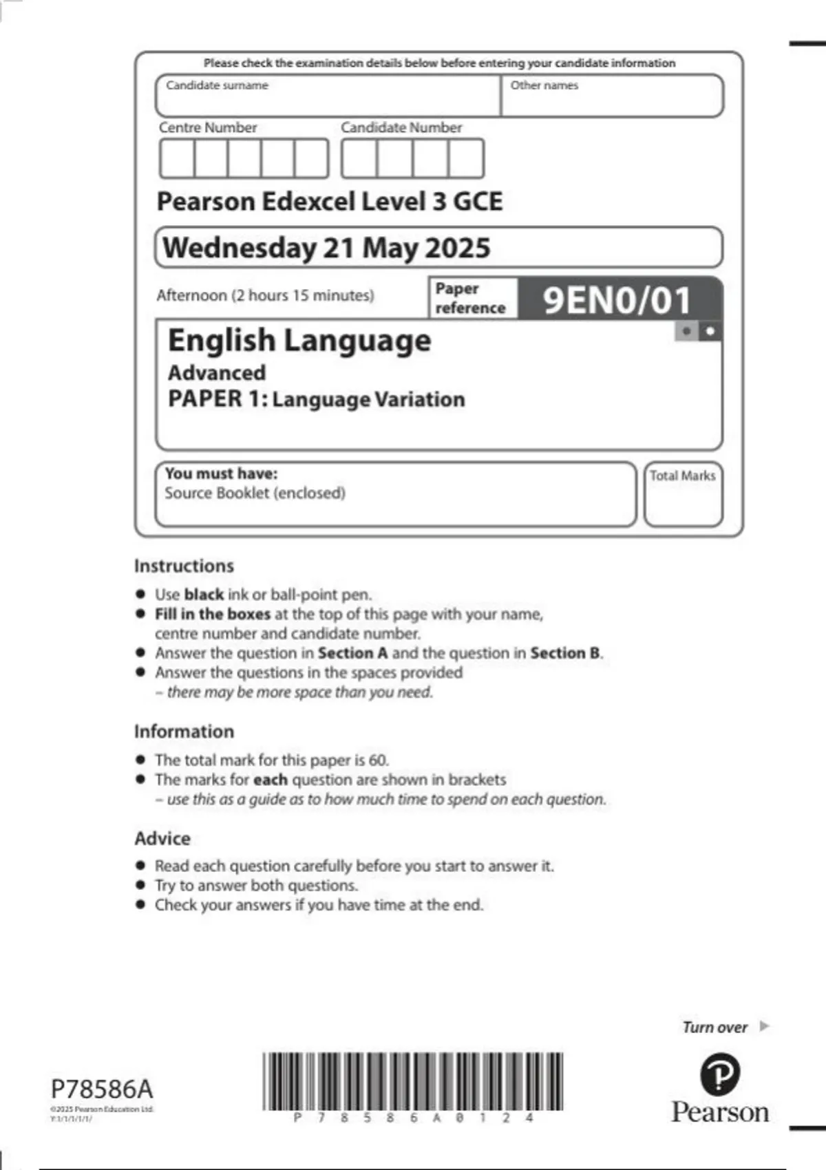 Pearson Edexcel a level English Language |question paper |2025|9EN0/01|
