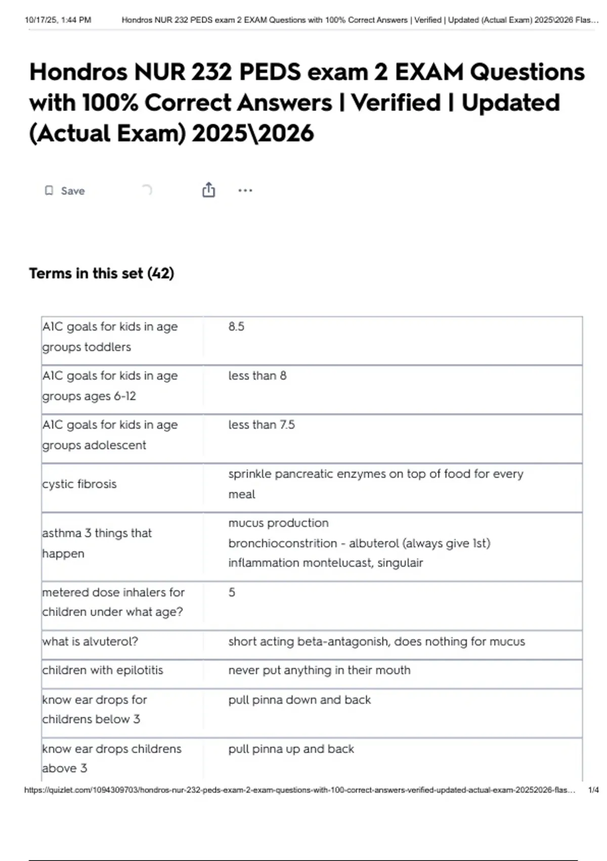 10/17/25, 1:44 PM Hondros NUR 232 PEDS exam 2 EXAM Questions with 100% Correct Answers | Verified | Updated (Actual Exam) 2025\2026 Flas…