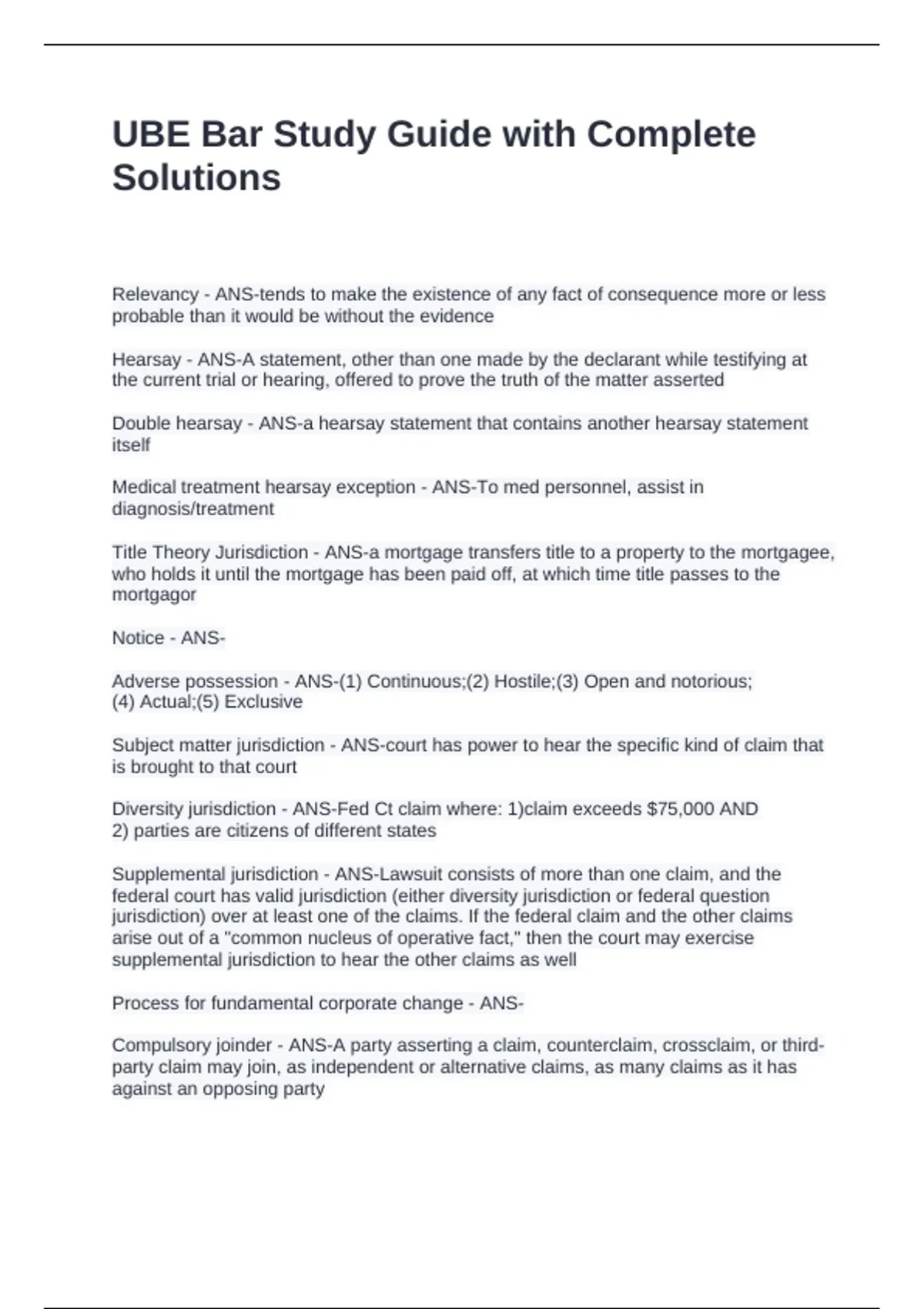 UBE Bar Study Guide with Complete Solutions