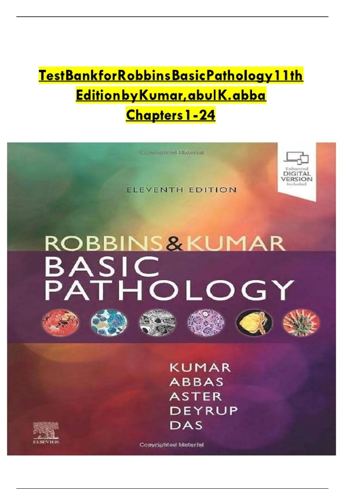 This comprehensive Test Bank contains multiple-choice questions and answers for all 24 chapters of Robbins & Kumar Basic Pathology, 11th Edition. It serves as an essential study resource for medical, nursing, and pathology students preparing for exams. It covers a wide range of topics in both general and systemic pathology, including: General Pathology: The Cell as a Unit of Health and Disease, Cell Injury, Inflammation and Repair, Hemodynamic Disorders, Diseases of the Immune System, and Neoplasia. Systemic Pathology: Diseases of the Heart, Lung, Kidney, Hematopoietic and Lymphoid Systems, Gastrointestinal Tract, Liver, Endocrine System, Central Nervous System, and Skin