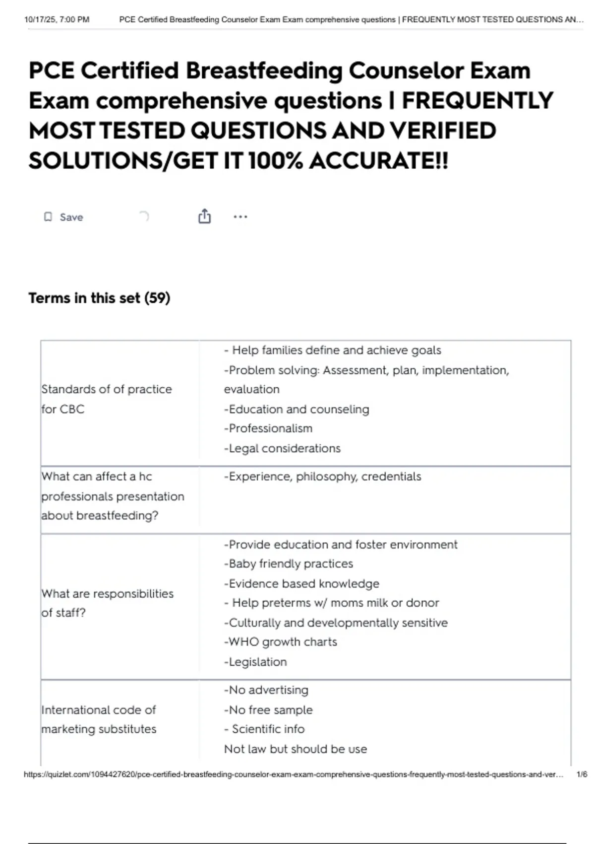 , 10/17/25, 7:00 PM PCE Certified Breastfeeding Counselor Exam Exam comprehensive questions | FREQUENTLY MOST TESTED QUESTIONS AN…
