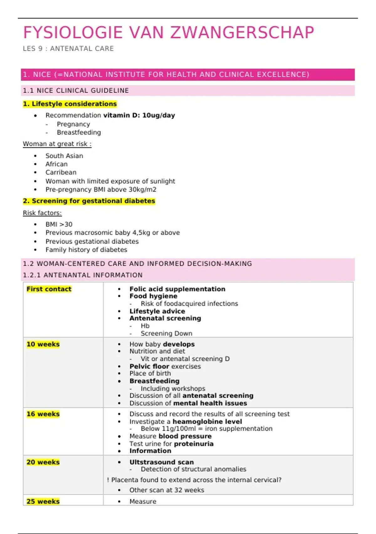 Deze samenvatting biedt een overzicht van de richtlijnen en aanbevelingen rond antenatale zorg volgens NICE, WHO en het Belgische KCE. Ideaal voor studenten vroedkunde. Inhoud: NICE-richtlijnen: - Leefstijladvies (vitamine D, voeding, werk) - Risicofactoren voor zwangerschapsdiabetes - Vrouwgerichte zorg en gedeelde besluitvorming - Uitgebreid overzicht van antenatale consultaties per zwangerschapsweek - Screening op anemie, infecties en mentale gezondheid - Behandeling van veelvoorkomende zwangerschapsklachten WHO-aanbevelingen: - 8 geplande antenatale contacten - Voedingsadvies en preventieve maatregelen (zoals malaria en anemie) - Beperking cafeïne-inname en rookpreventie KCE (België): - Prenataal zorgpad voor laagrisicozwangerschappen - Definitie van een positieve zwangerschapservaring - Verbeterpunten in de organisatie van zorg - Consultaties voor persoonlijk prenataal advies (PPA) - Voorbereiding op arbeid, bevalling en ouderschap Handig voor: Studenten die snel inzicht willen krijgen in de structuur van antenatale zorg, inclusief screeningsmomenten, richtlijnen en evidence-based aanbevelingen.