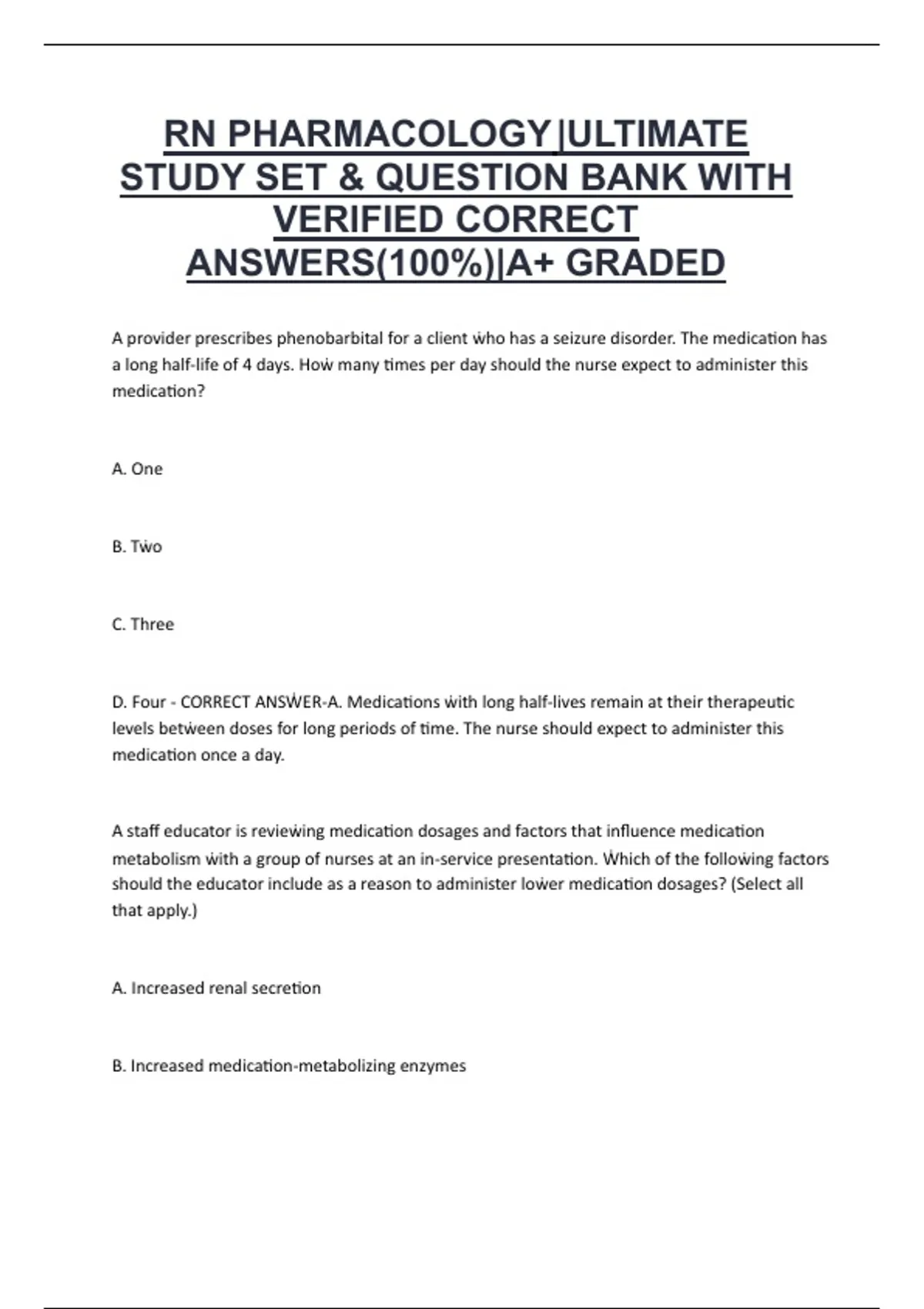 This document provides the ultimate RN Pharmacology study set and question bank, featuring 100% verified correct answers with detailed explanations. It covers all essential pharmacology topics required for nursing students, including drug classifications and prototypes, mechanisms of action, therapeutic uses, side effects and contraindications, safe dosage and administration, and nursing considerations. Perfect for preparing for the ATI Pharmacology Proctored Exam or NCLEX-RN, this A+ graded resource strengthens medication knowledge, promotes clinical safety, and enhances test performance.